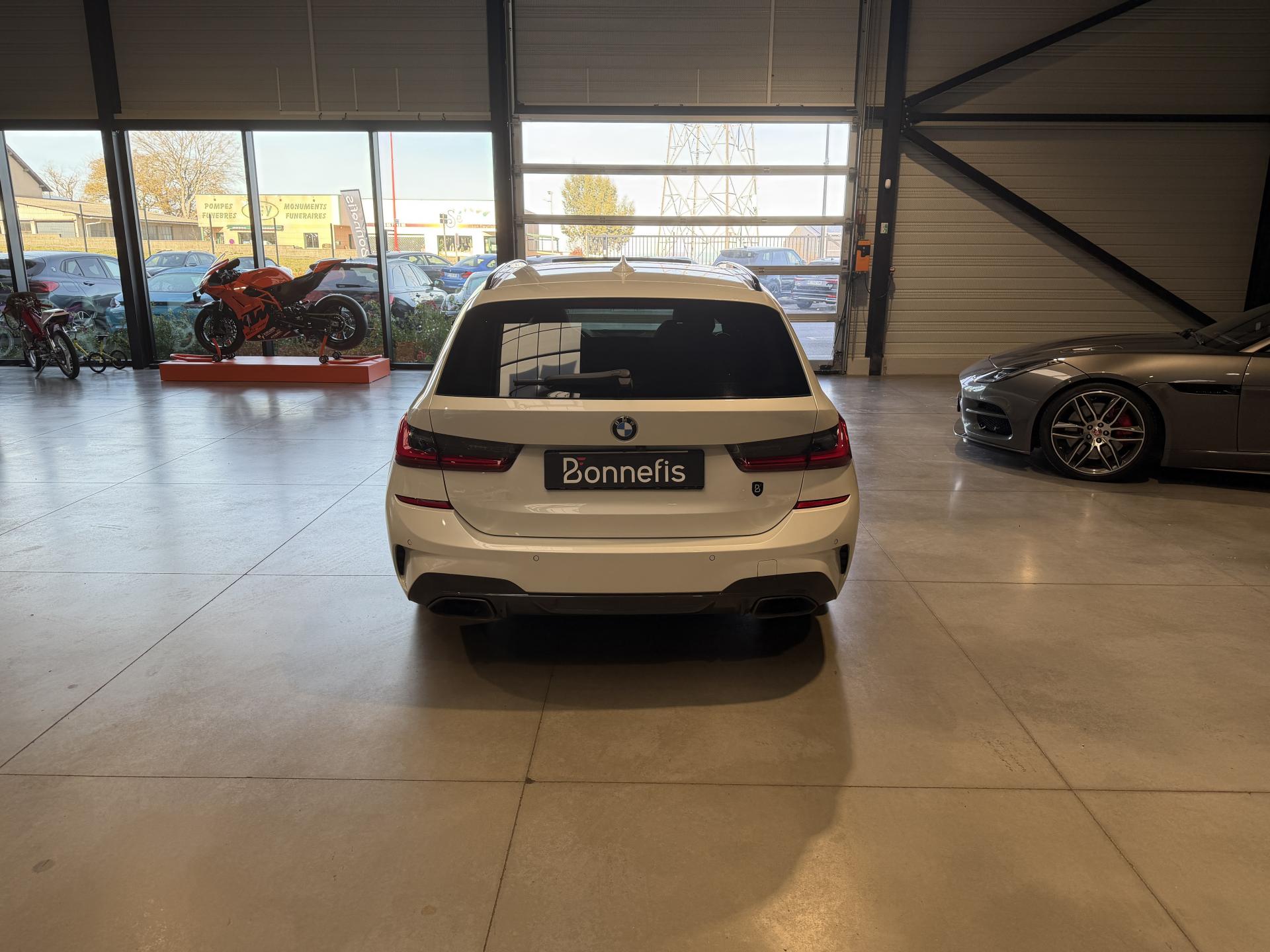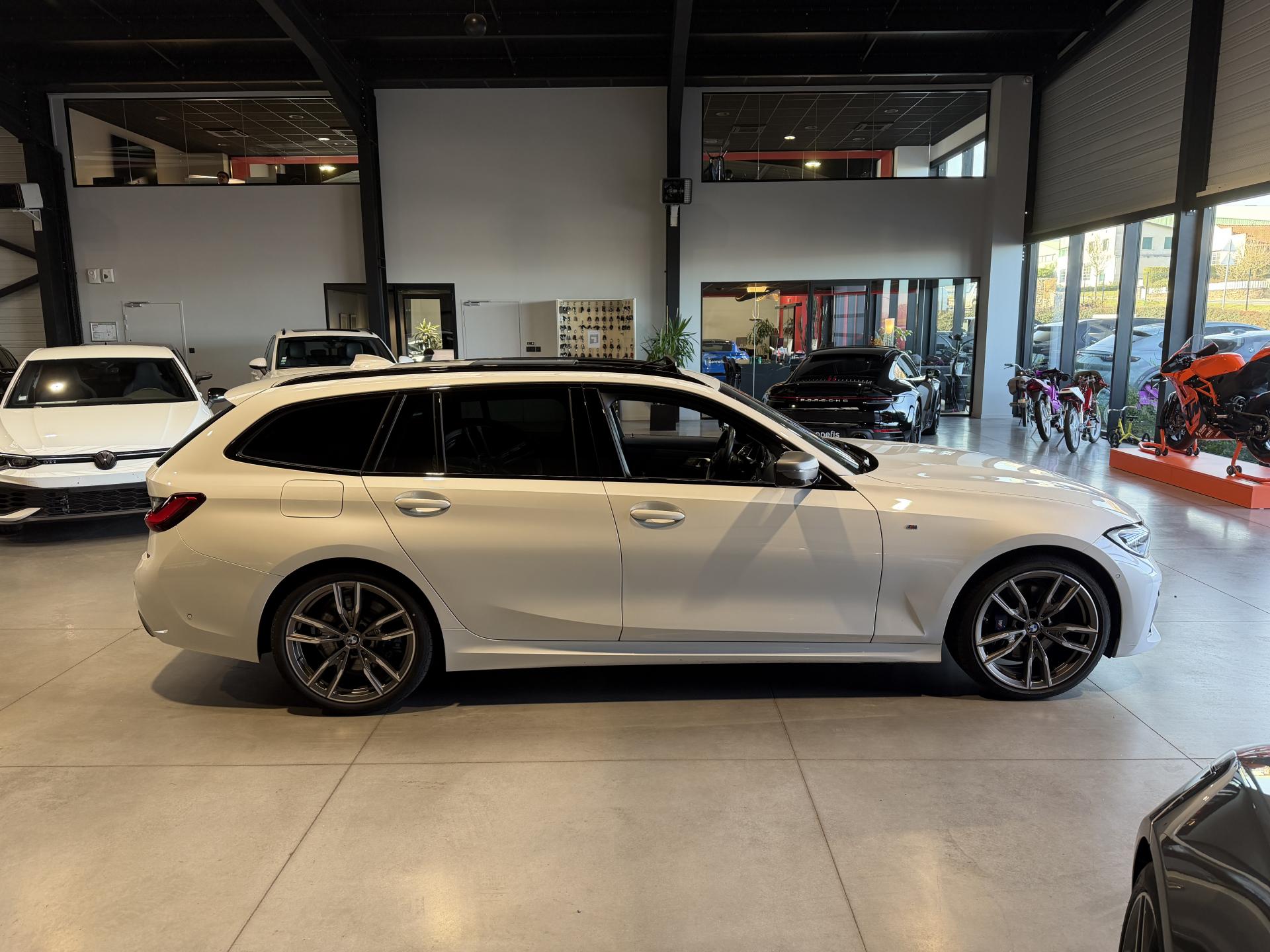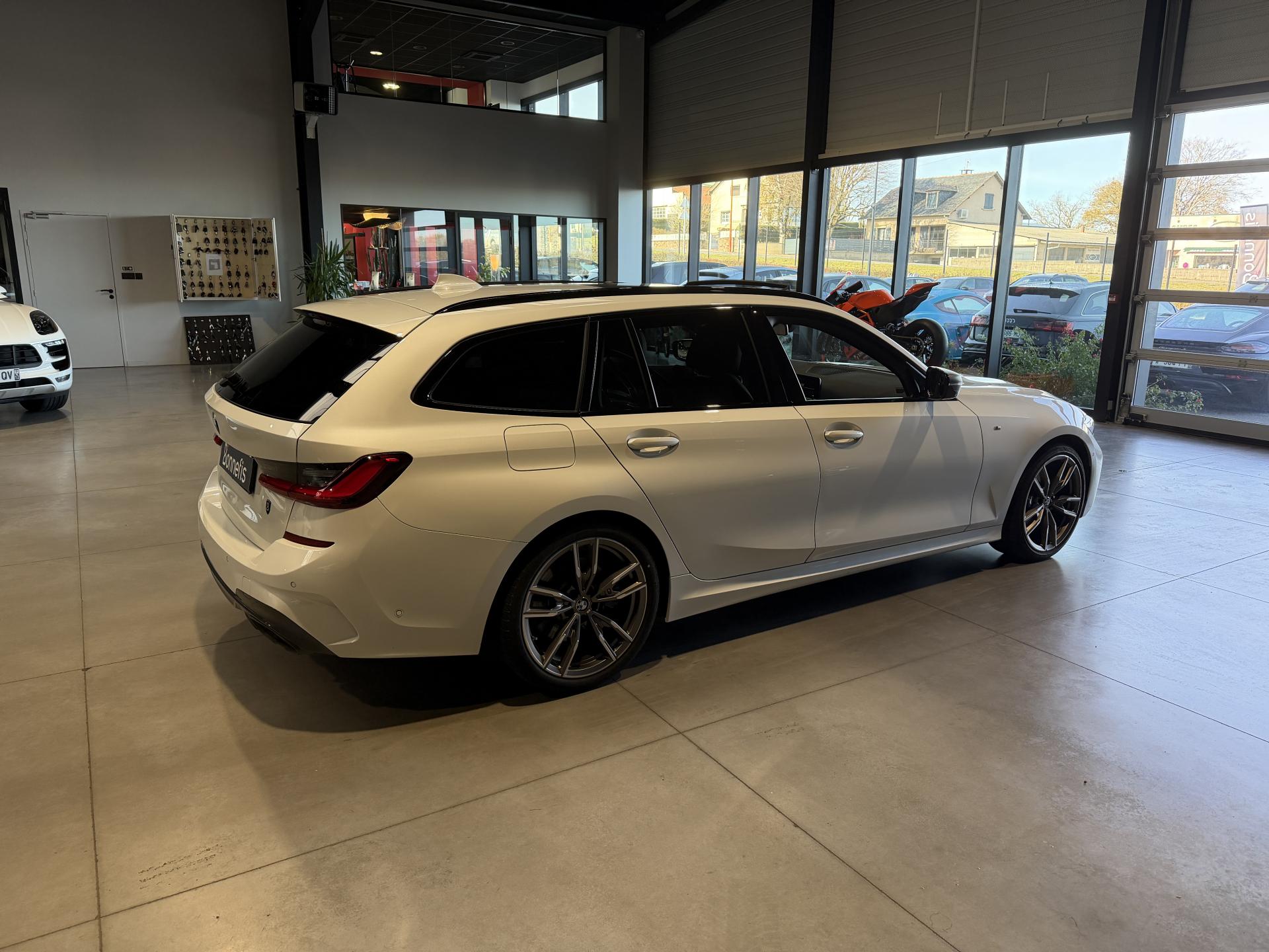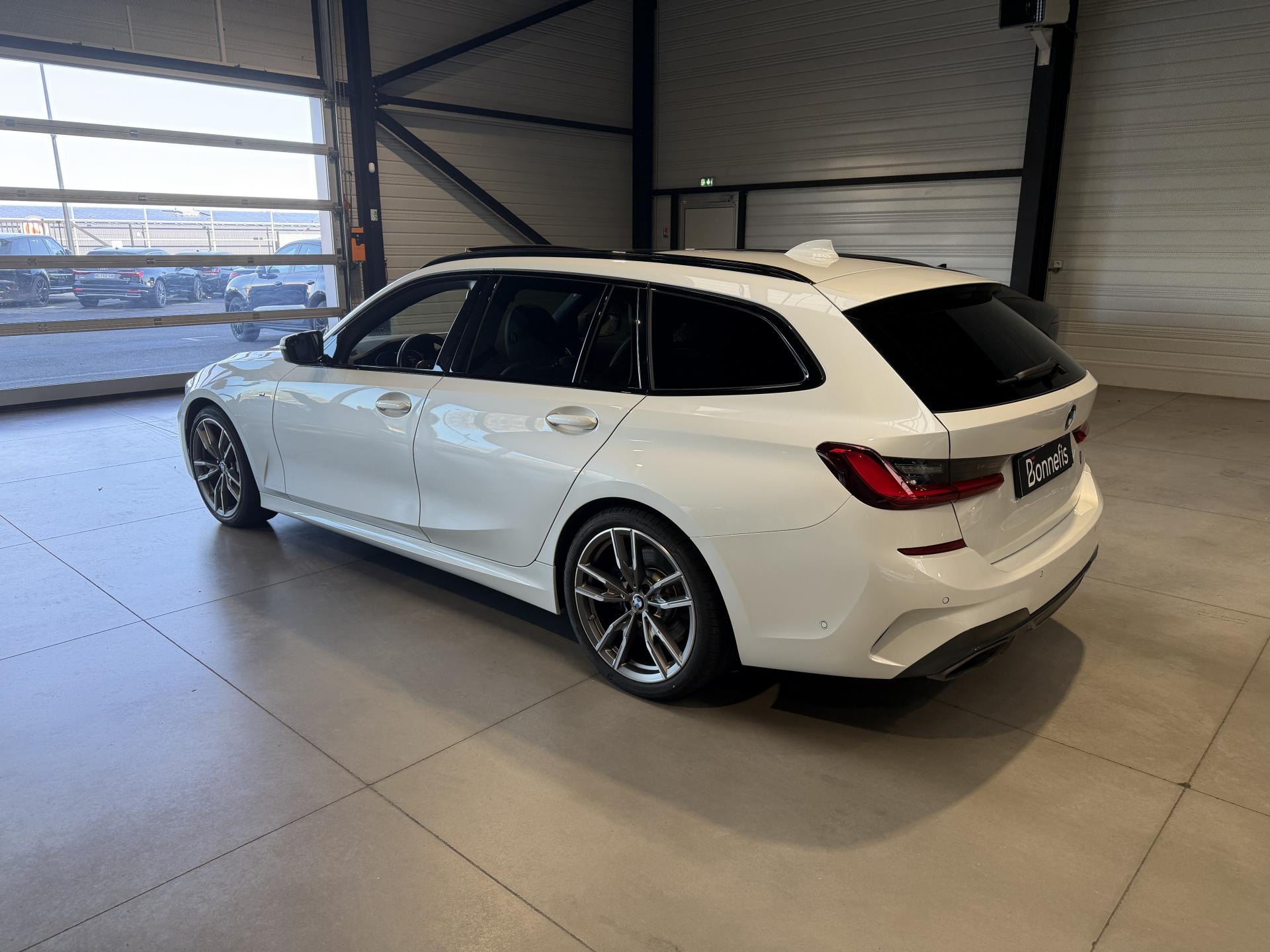 BMW Série 3 Touring 340D Xdrive X drive TOURING 340 Ch G 21 M Sport BVA break, extérieur blanc métalisée, intérieur Alcantara / Similicuir Sensatec "Schwarz" avec surpiqûres contrastantes bleues, 22 Cv, 5 portes, première mise en circulation le 04/08/2020.