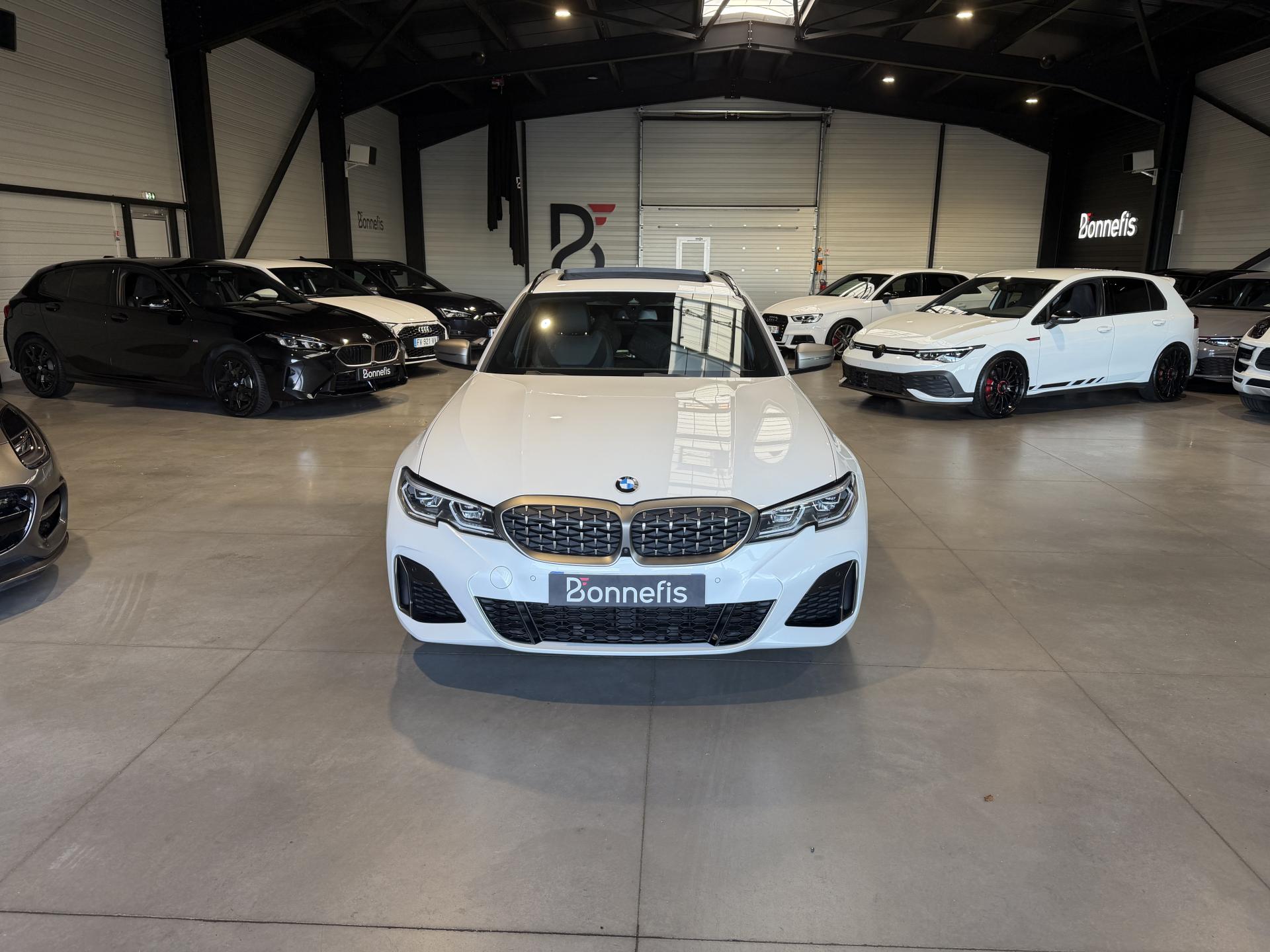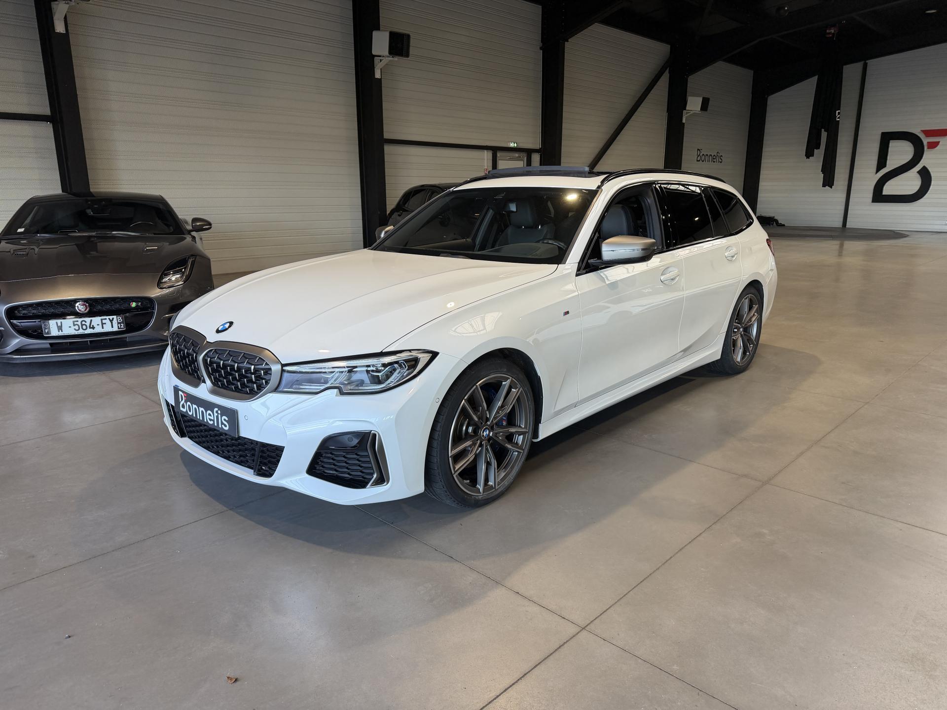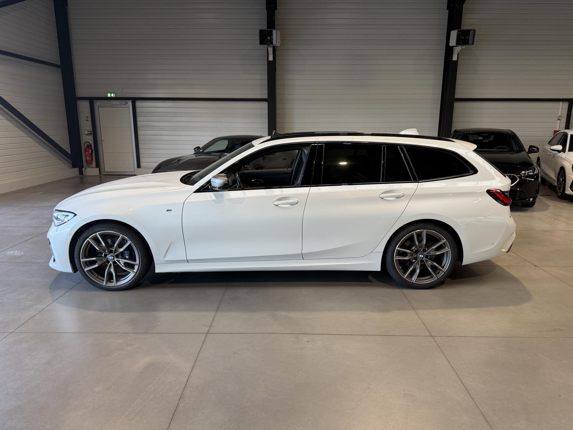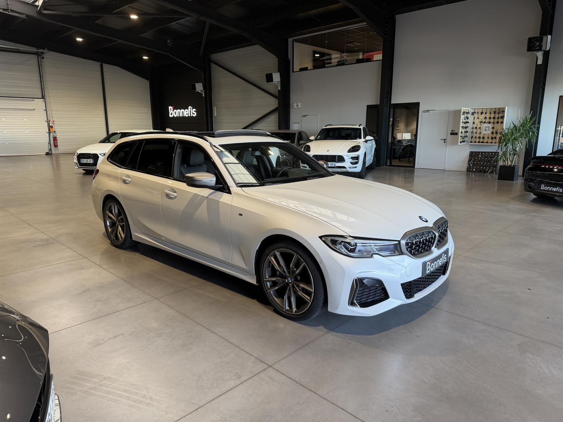 BMW Série 3 Touring 340D Xdrive X drive TOURING 340 Ch G 21 M Sport BVA break, extérieur blanc métalisée, intérieur Alcantara / Similicuir Sensatec "Schwarz" avec surpiqûres contrastantes bleues, 22 Cv, 5 portes, première mise en circulation le 04/08/2020.