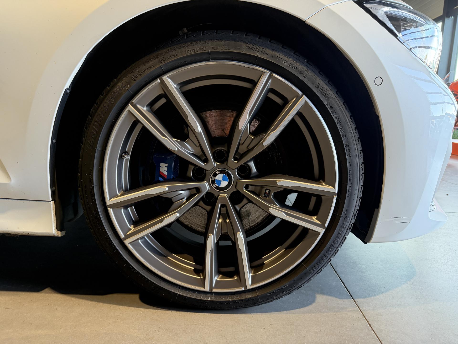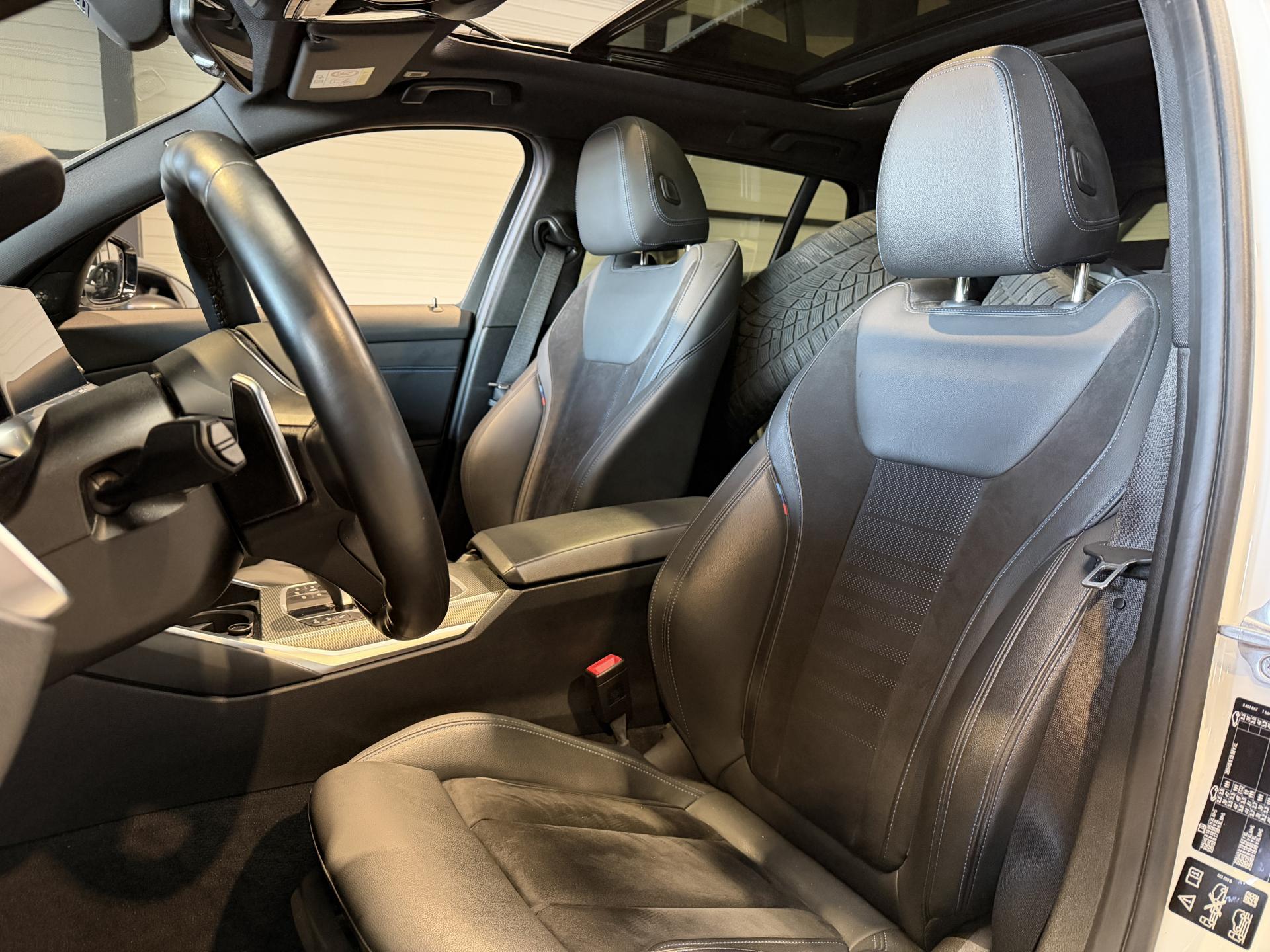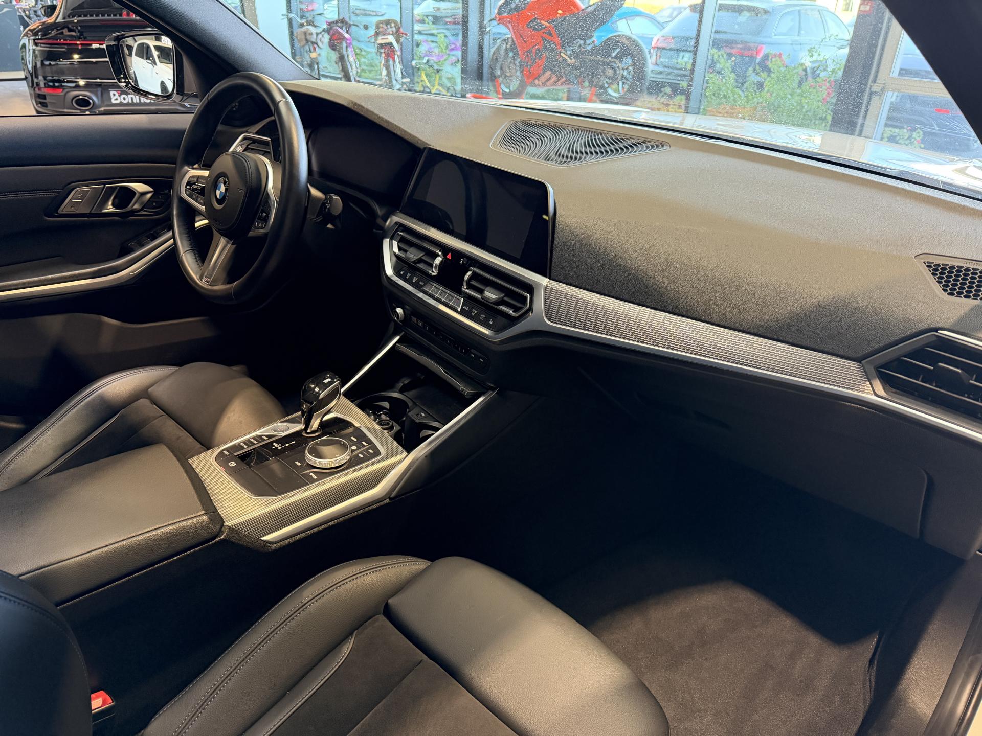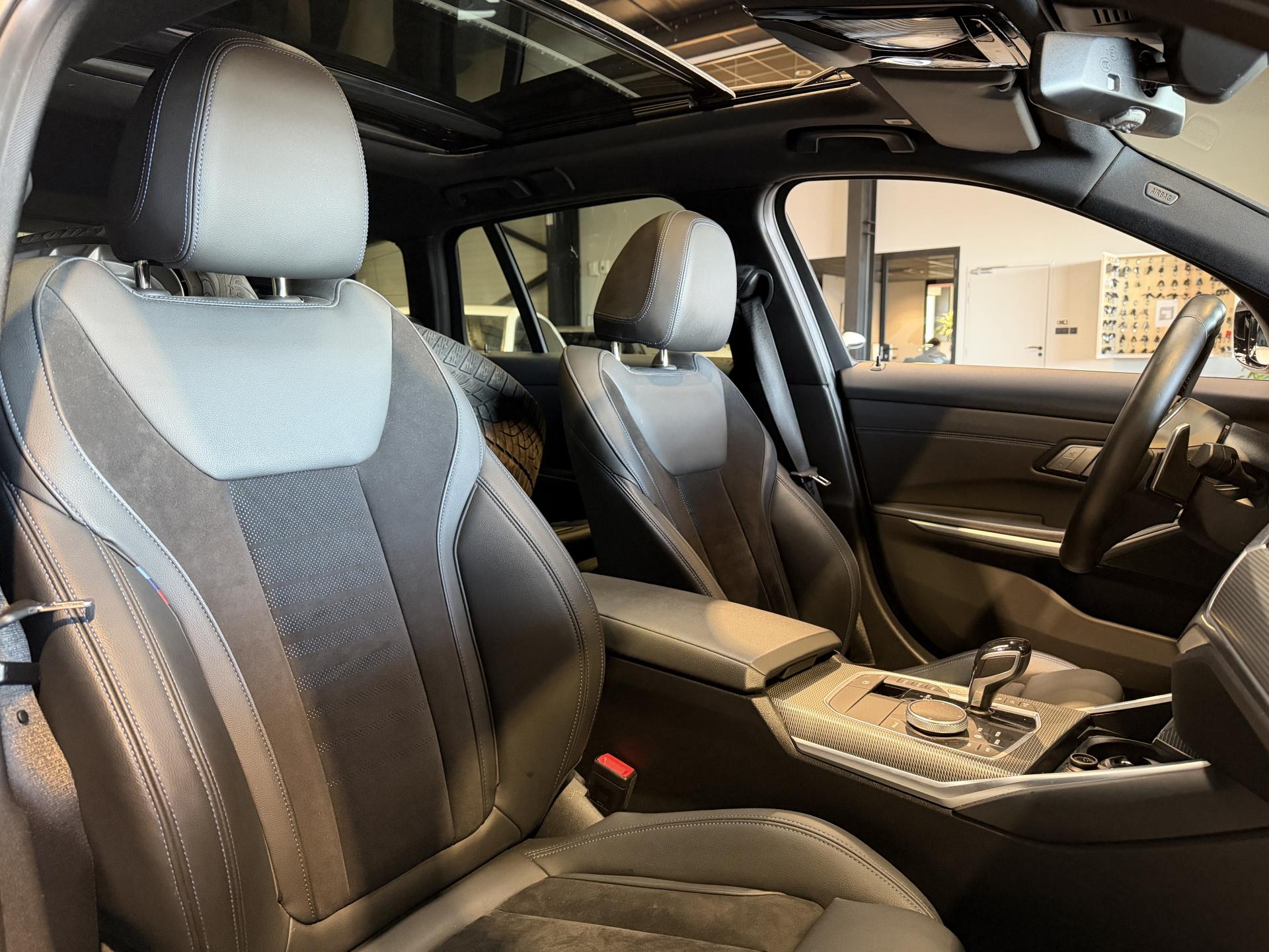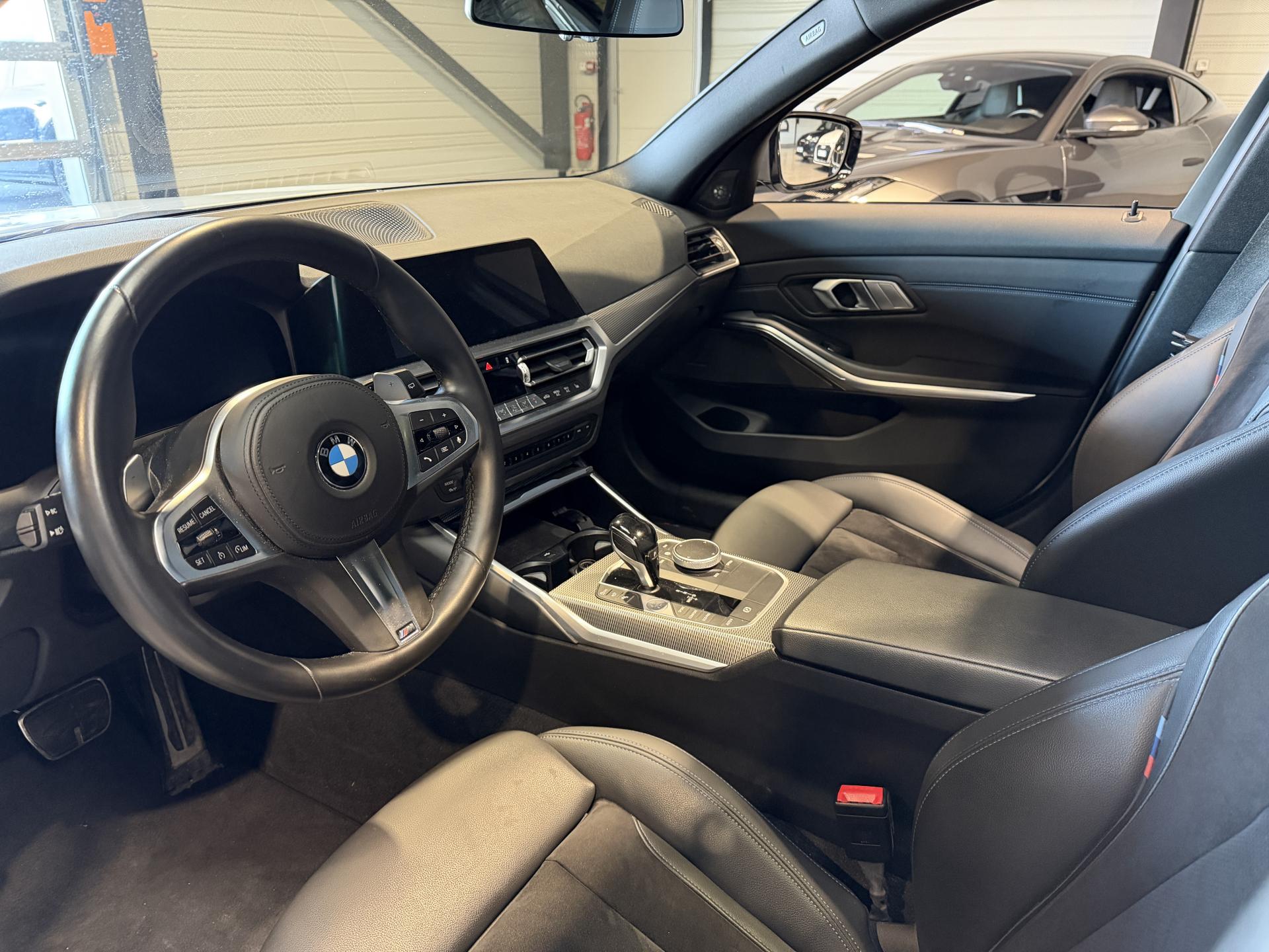 BMW Série 3 Touring 340D Xdrive X drive TOURING 340 Ch G 21 M Sport BVA break, extérieur blanc métalisée, intérieur Alcantara / Similicuir Sensatec "Schwarz" avec surpiqûres contrastantes bleues, 22 Cv, 5 portes, première mise en circulation le 04/08/2020.