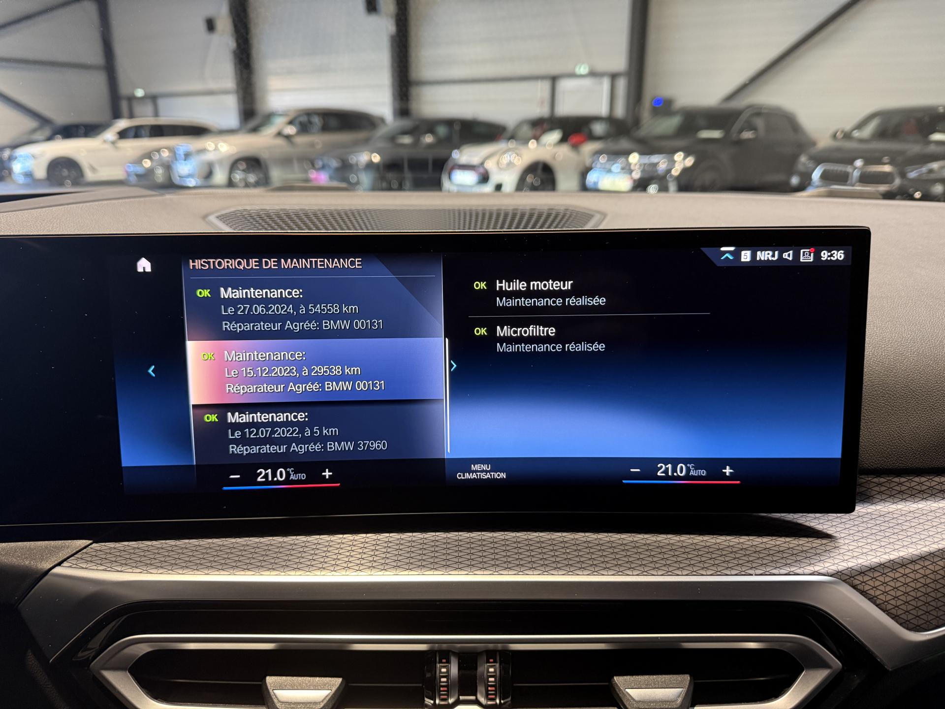 Nombreuses options : GPS, caméra de recul, Apple Carplay, radars avants et arrières de détection d'obstacles, régulateur de vitesses actif ( ACC / Active Cruise Control ) ( 583 € ), vitrage calorifuge ( 366 € ), boîte de vitesses automatique Sport 8 rapports avec palettes au volant ( 166 € ), siège conducteur avec soutien lombaire ( 133 € ), kit de mobilité BMW ( 45 € ), BMW Live Cockpit Navigation Pro avec Affichage Tête Haute HUD en relation avec Pack Innovation, sièges AV électriques à mémoire conducteur, sièges AV chauffants, recharge sans fil par induction, système Hi-Fi, climatisation automatique 3 zones, Park Assist, Drive Assist, accès confort avec préparation "BMW Digital Key", ciel de pavillon M Anthracite, rétroviseurs extérieurs rabattables électriquement, électrochrome côté conducteur, éclairage d'ambiance avec tapis de lumière, feux de route anti-éblouissement, vitrage insonorisant, mesure individuelle de pression des pneumatiques, hayon de coffre électrique, ...