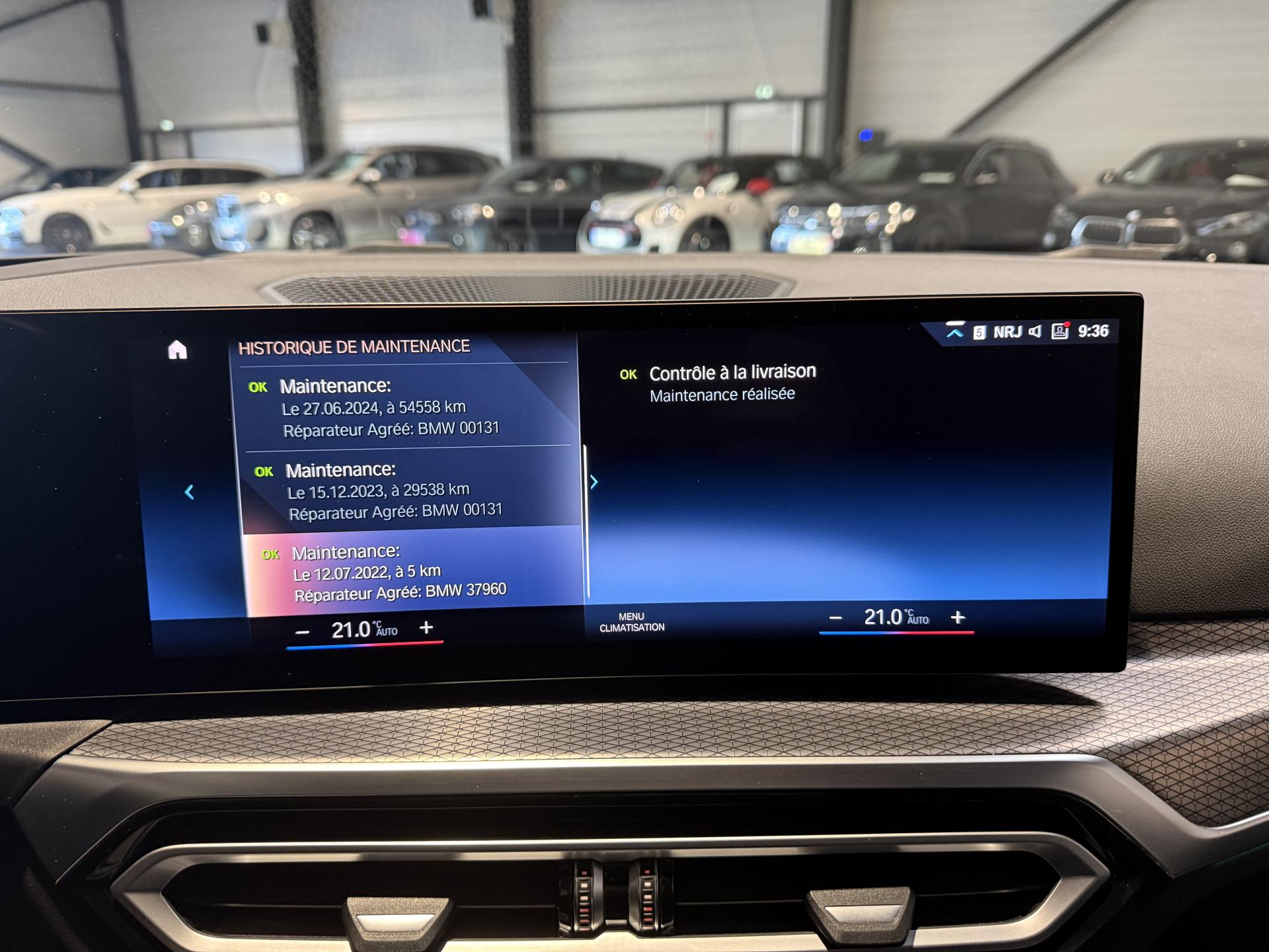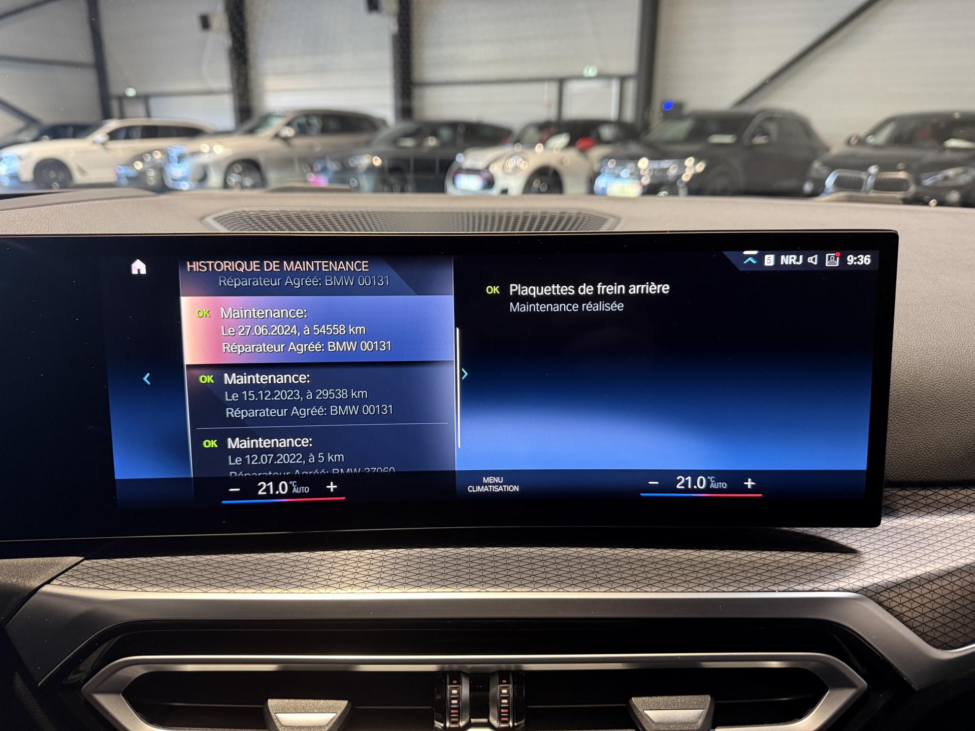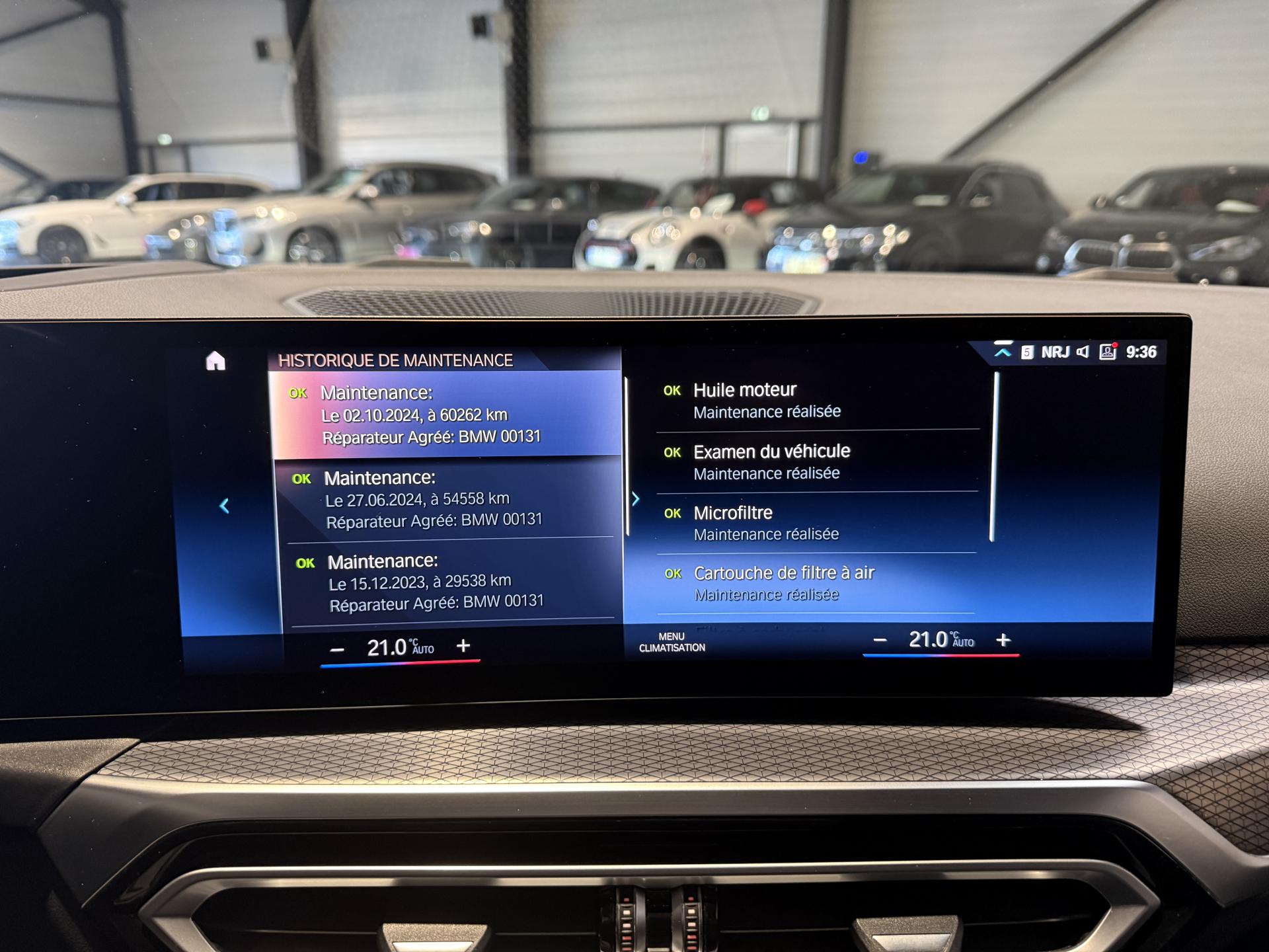 Nombreuses options : GPS, caméra de recul, Apple Carplay, radars avants et arrières de détection d'obstacles, régulateur de vitesses actif ( ACC / Active Cruise Control ) ( 583 € ), vitrage calorifuge ( 366 € ), boîte de vitesses automatique Sport 8 rapports avec palettes au volant ( 166 € ), siège conducteur avec soutien lombaire ( 133 € ), kit de mobilité BMW ( 45 € ), BMW Live Cockpit Navigation Pro avec Affichage Tête Haute HUD en relation avec Pack Innovation, sièges AV électriques à mémoire conducteur, sièges AV chauffants, recharge sans fil par induction, système Hi-Fi, climatisation automatique 3 zones, Park Assist, Drive Assist, accès confort avec préparation "BMW Digital Key", ciel de pavillon M Anthracite, rétroviseurs extérieurs rabattables électriquement, électrochrome côté conducteur, éclairage d'ambiance avec tapis de lumière, feux de route anti-éblouissement, vitrage insonorisant, mesure individuelle de pression des pneumatiques, hayon de coffre électrique, ...