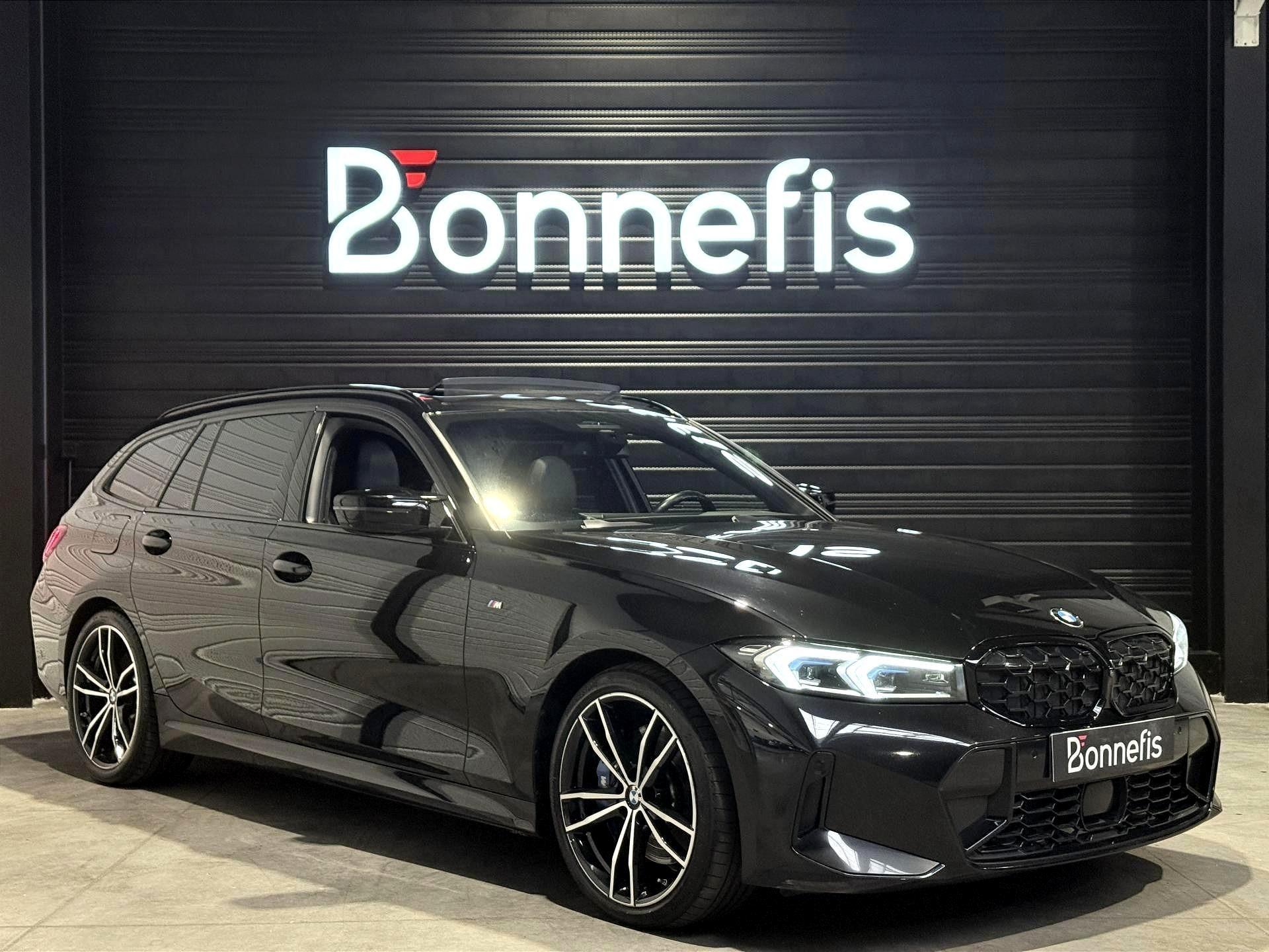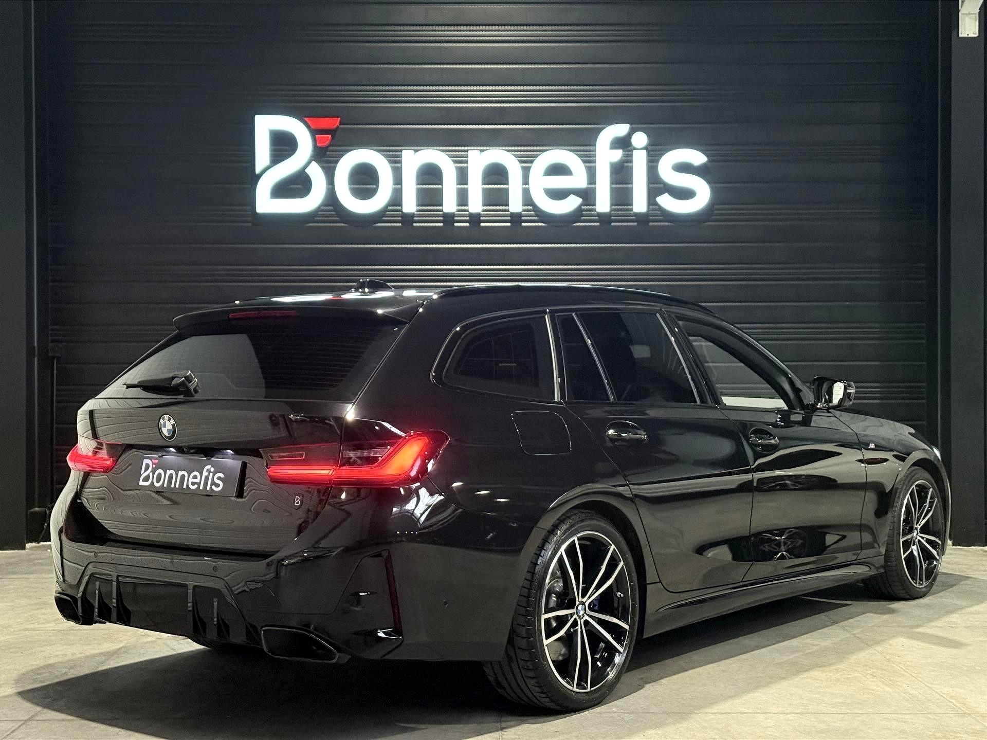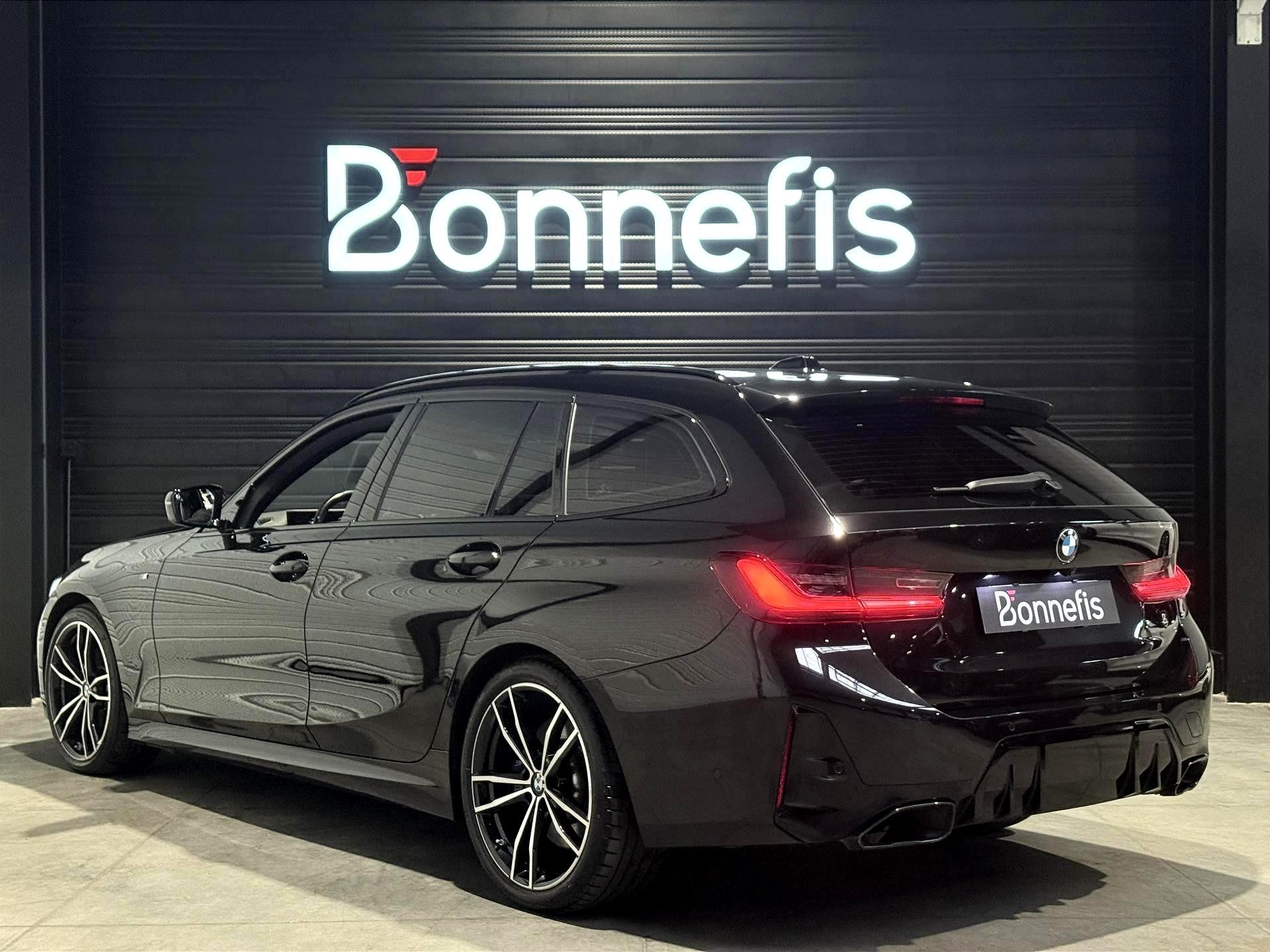 BMW Série 3 Touring 340d 3.0 340 Ch G 21 LCI M Sport BVA X Drive break, extérieur noir métallisée ( 908 € ), intérieur Sellerie Alcantara / Similicuir Sensatec "Schwarz" avec surpiqûres contrastantes Bleues, 22 cv, 5 portes, première mise en circulation le 18/10/2022.