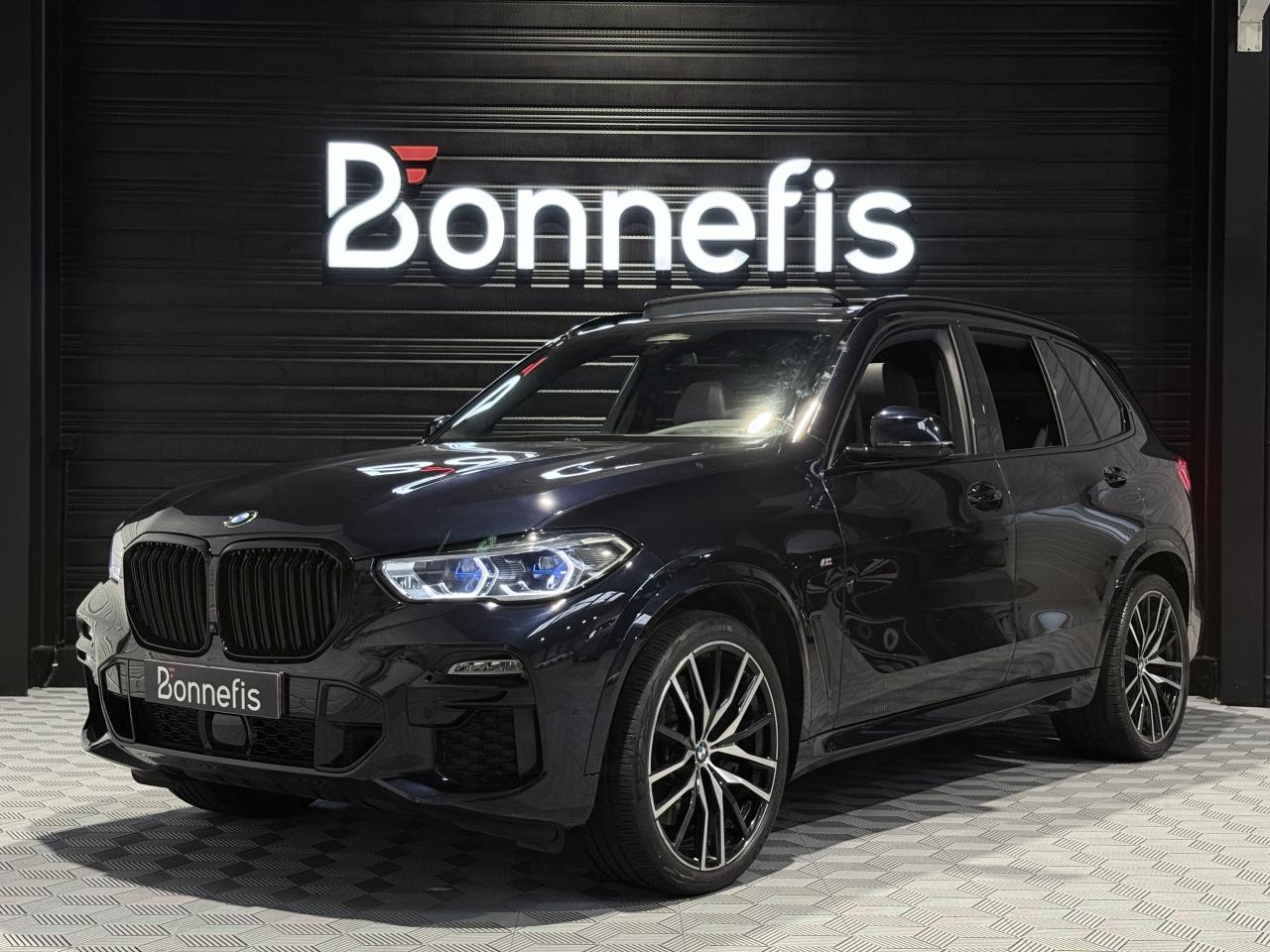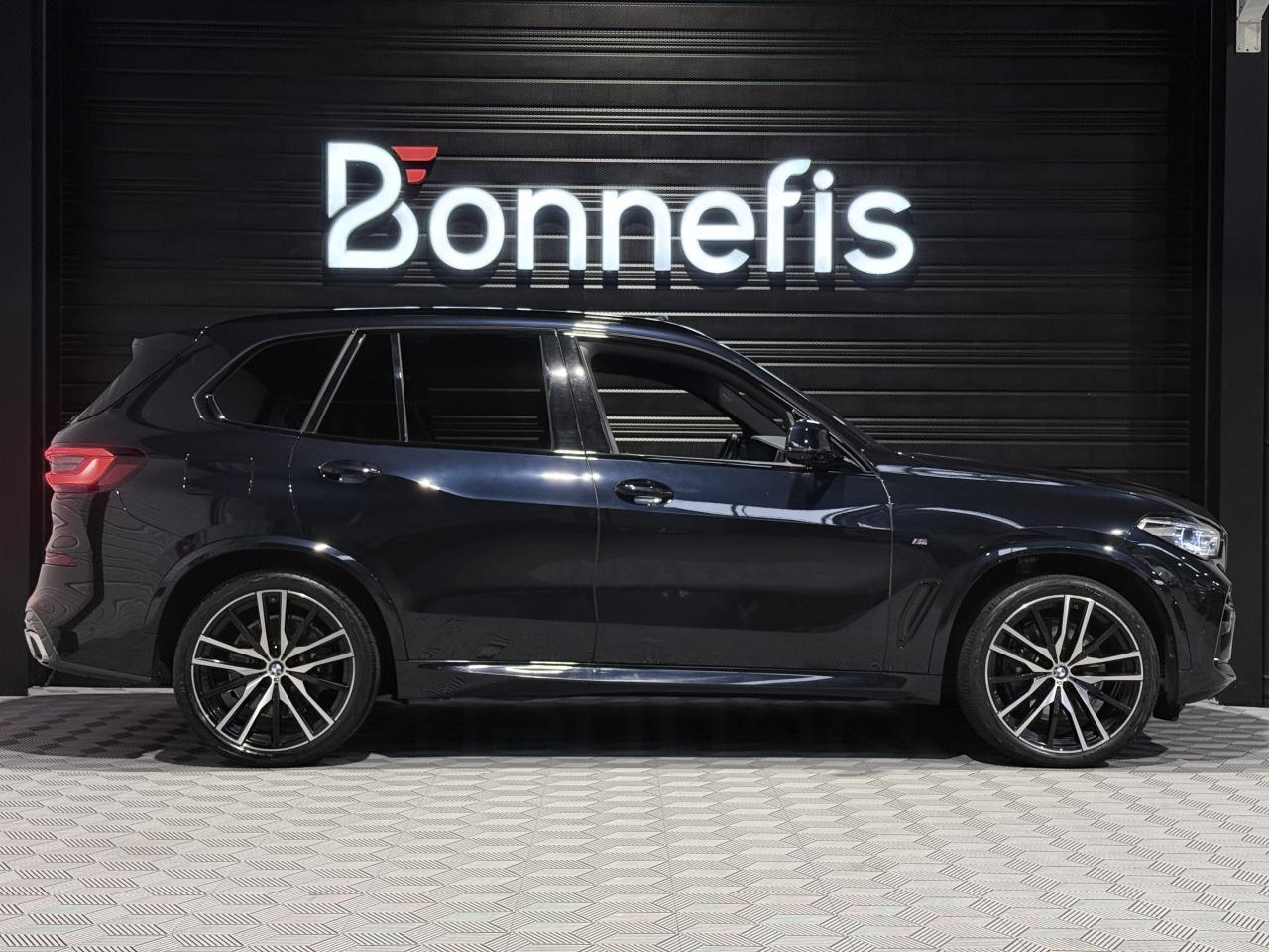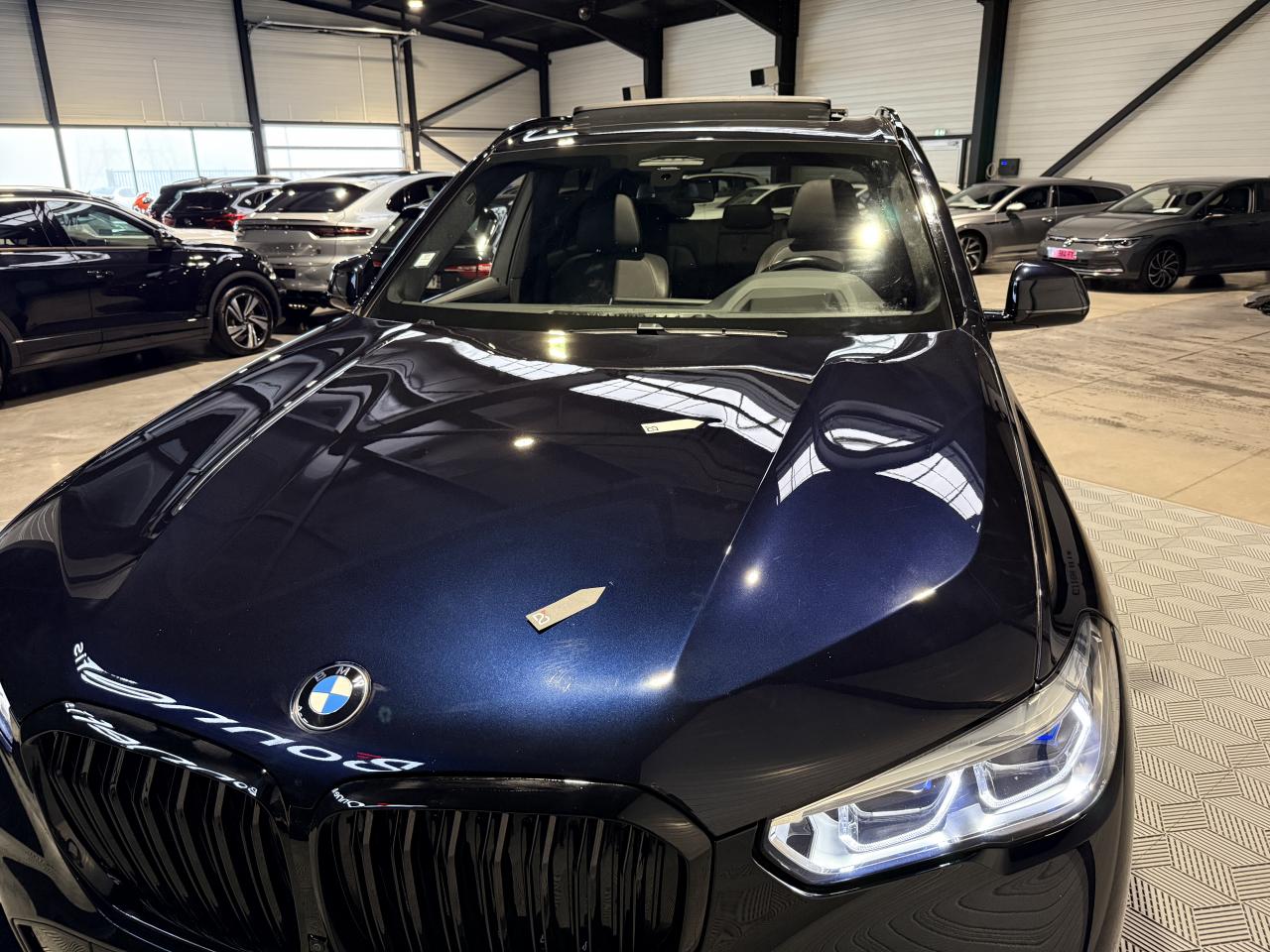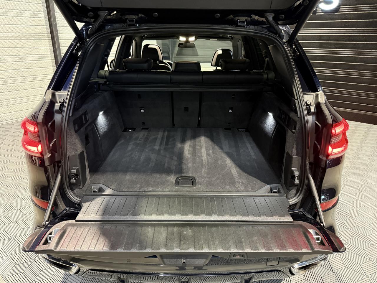 BMW X5 M 40D G05 3.0 340 Ch BVA8 M Sport 5p xDrive tout-terrain, extérieur bleu foncé métallisée ( carbonschwarz métallisée )( 1 000 € ), intérieur Sellerie Cuir noir, 22 cv, 5 portes, première mise en circulation le 07/07/2021.