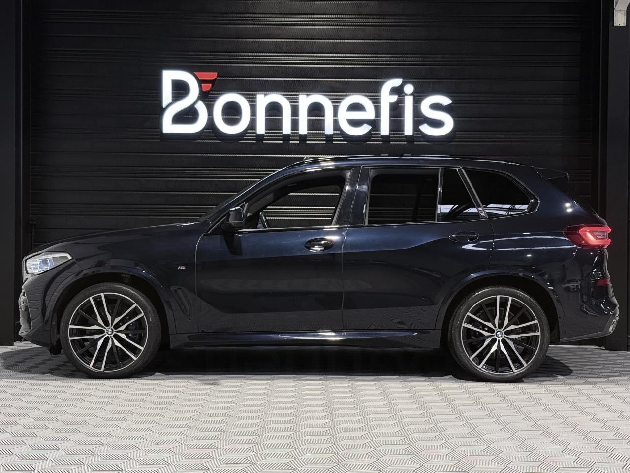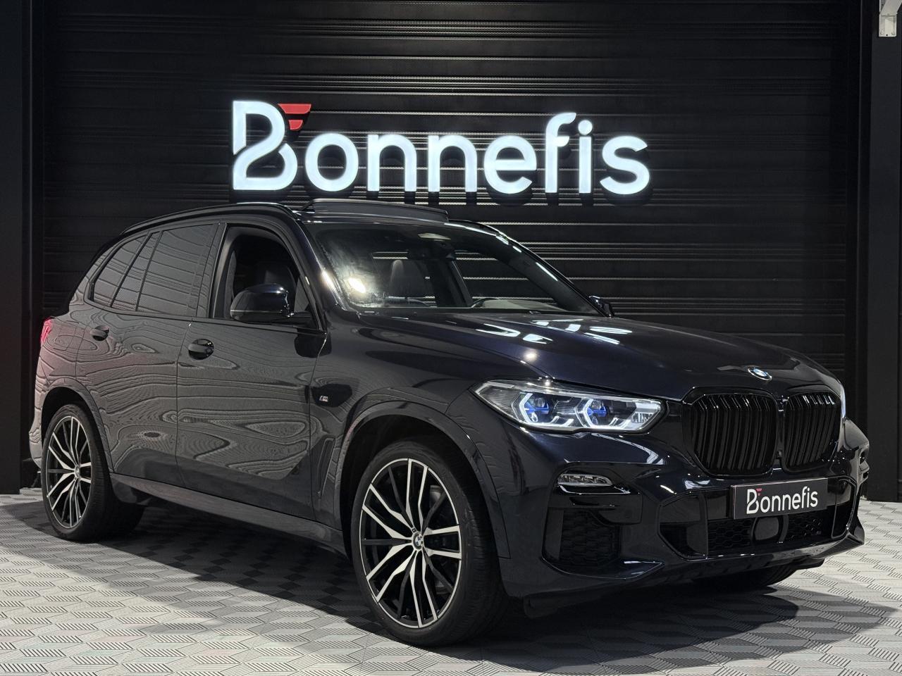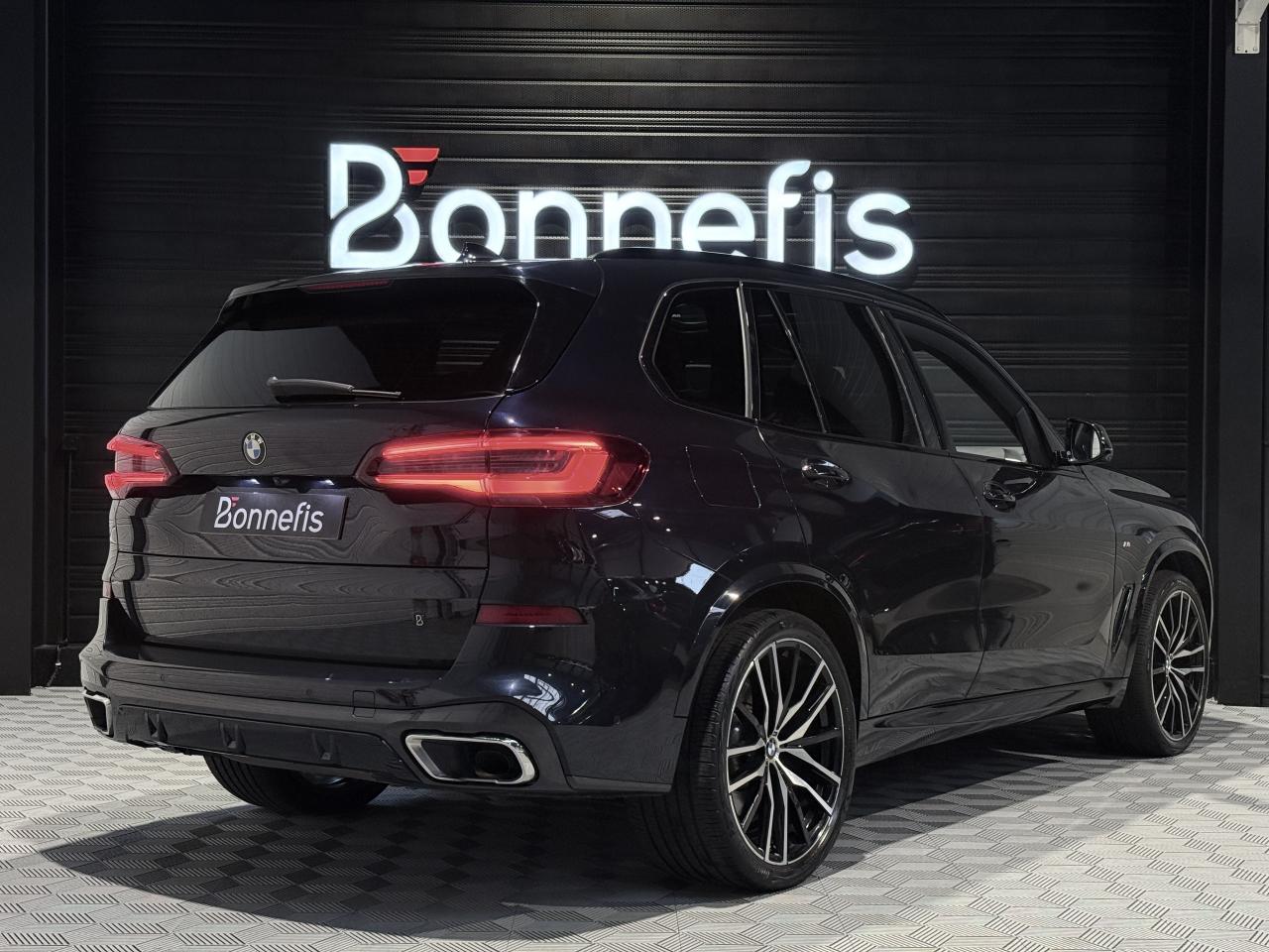 BMW X5 M 40D G05 3.0 340 Ch BVA8 M Sport 5p xDrive tout-terrain, extérieur bleu foncé métallisée ( carbonschwarz métallisée )( 1 000 € ), intérieur Sellerie Cuir noir, 22 cv, 5 portes, première mise en circulation le 07/07/2021.
