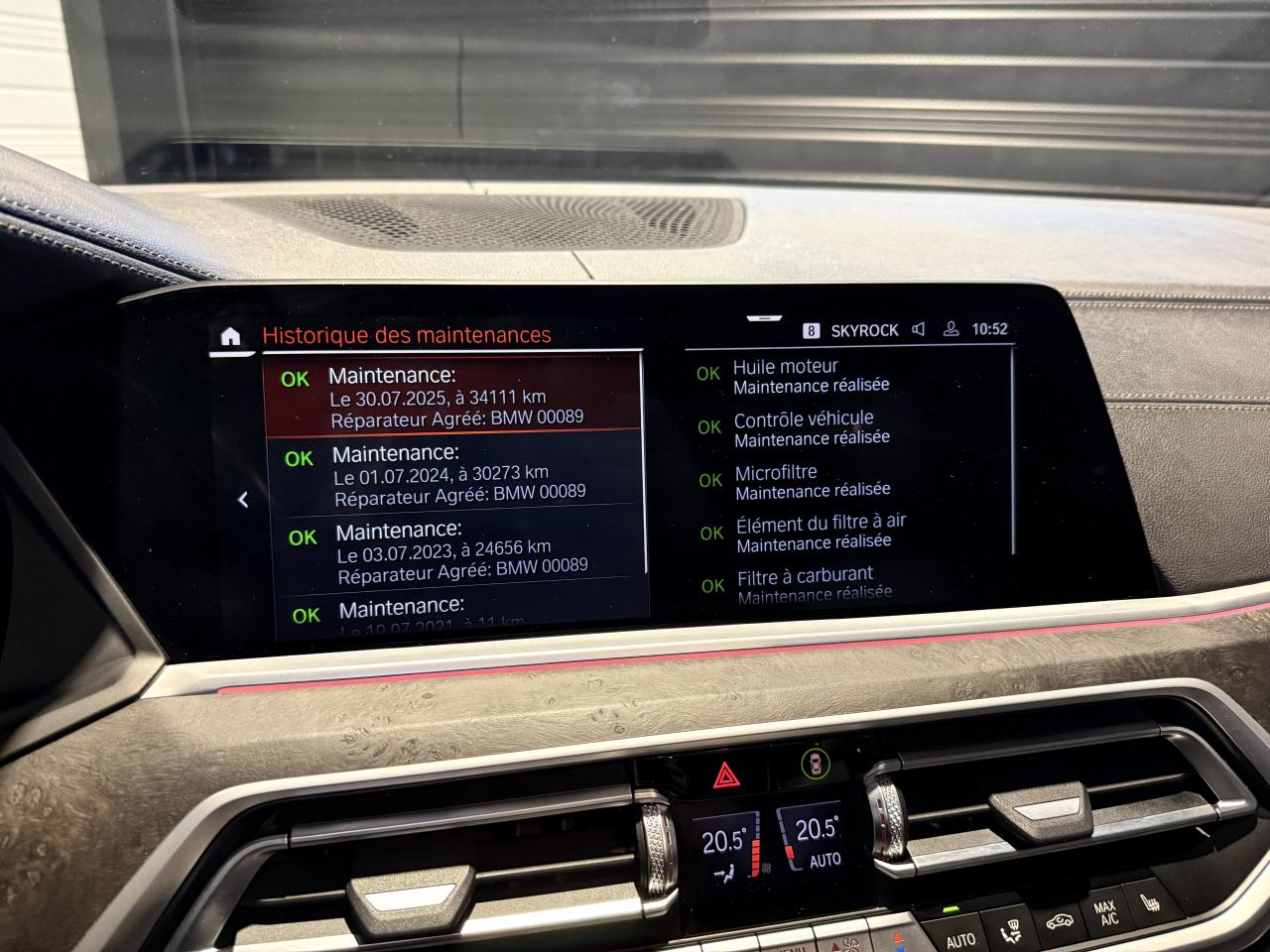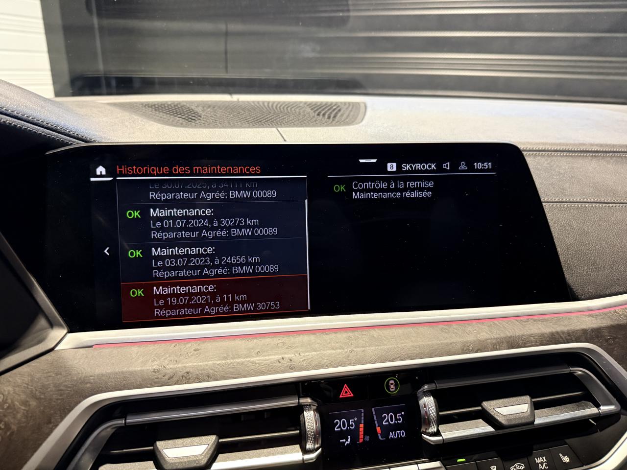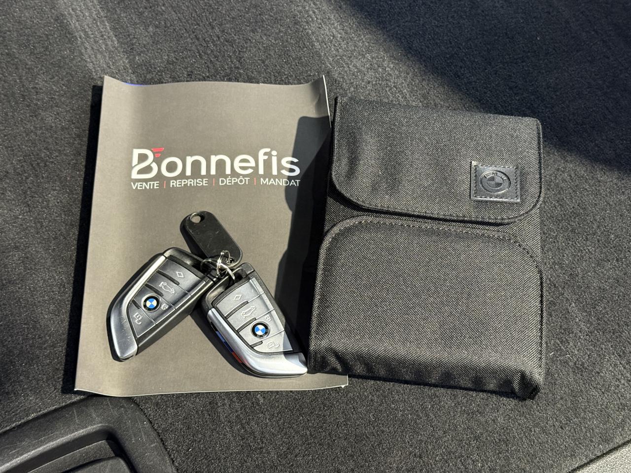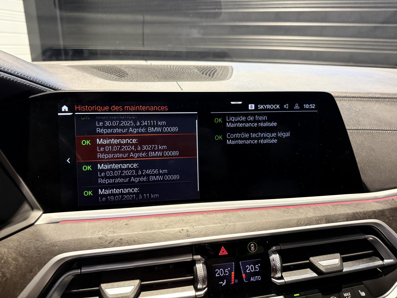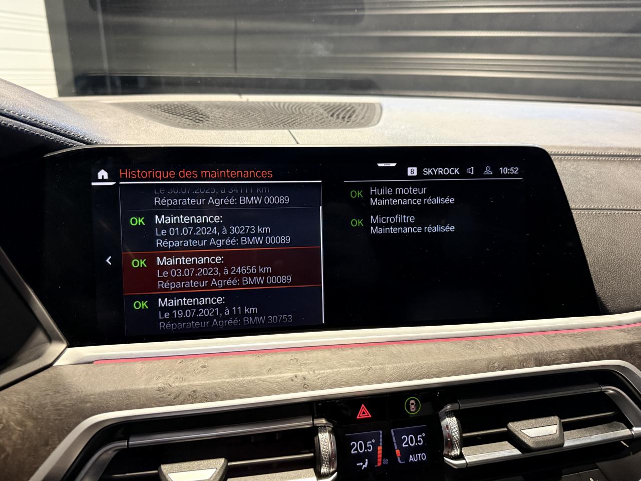 Nombreuses options : GPS, caméra de recul, Apple Carplay, radars avants et arrières de détection d'obstacles, Jantes en alliage 22" style 742 M bicolores à rayons doubles ( 1 791 € ), Laser BMW ( 1 708 € ), Toit ouvrant panoramique électrique en verre ( 1 625 € ), Affichage Tête Haute HUD couleur ( 1 216 € ), Sièges Advanced Comfort AV ( 1 083 € ), Crochet d'attelage entièrement électrique ( 1 041 € ), Accès Confort avec suppression "BMW Digital Key" ( 1 000 € ), Climatisation automatique 4 zones ( 608 € ), Fermeture assistée des portes Soft Close ( 541 € ), Système de manoeuvres entièrement automatiques "Park Assist Plus" ( 541 € ), Protection active des occupants ( 500 € ), Inserts décoratifs en bois précieux de peuplier gainé brun anthracite à pores ouverts ( 416 € ), Système haut-parleurs HiFi ( 416 € ), Vitrage calorifuge ( 416 € ), Sièges AV/AR chauffants ( 708 € ), Filet de séparation du coffre ( 166 € ), BMW Gesture Command ( 250 € ), Porte-boissons chauffant et réfrigérant ( 250 € ), Télécommande universelle intégrée ( 250 € ), Freins M Sport étriers de freins bleus avec désignation M, Alarme antivol, Appel d'Urgence Intelligent (durée de vie de la voiture), BMW Live Cockpit Navigation Pro, Boîte de vitesses automatique Sport avec palettes au volant, Ciel de pavillon M anthracite, Mesure individuelle de pression des pneumatiques, Rétroviseurs extérieurs rabattables électriquement, rétroviseurs intérieur et extérieur (côté conducteur) électrochromes, hayon de coffre électrique, ...