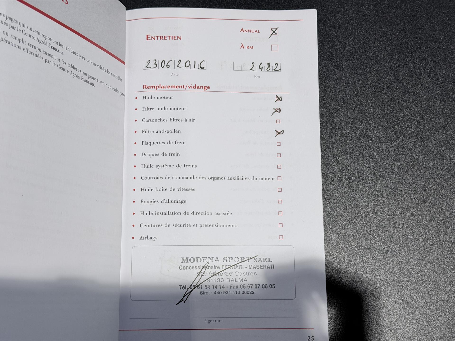 - 1er entretien fait le 23/06/2016 à 2 482Km chez Ferrari Toulouse. ( Vidange moteur + filtre anti-pollen )