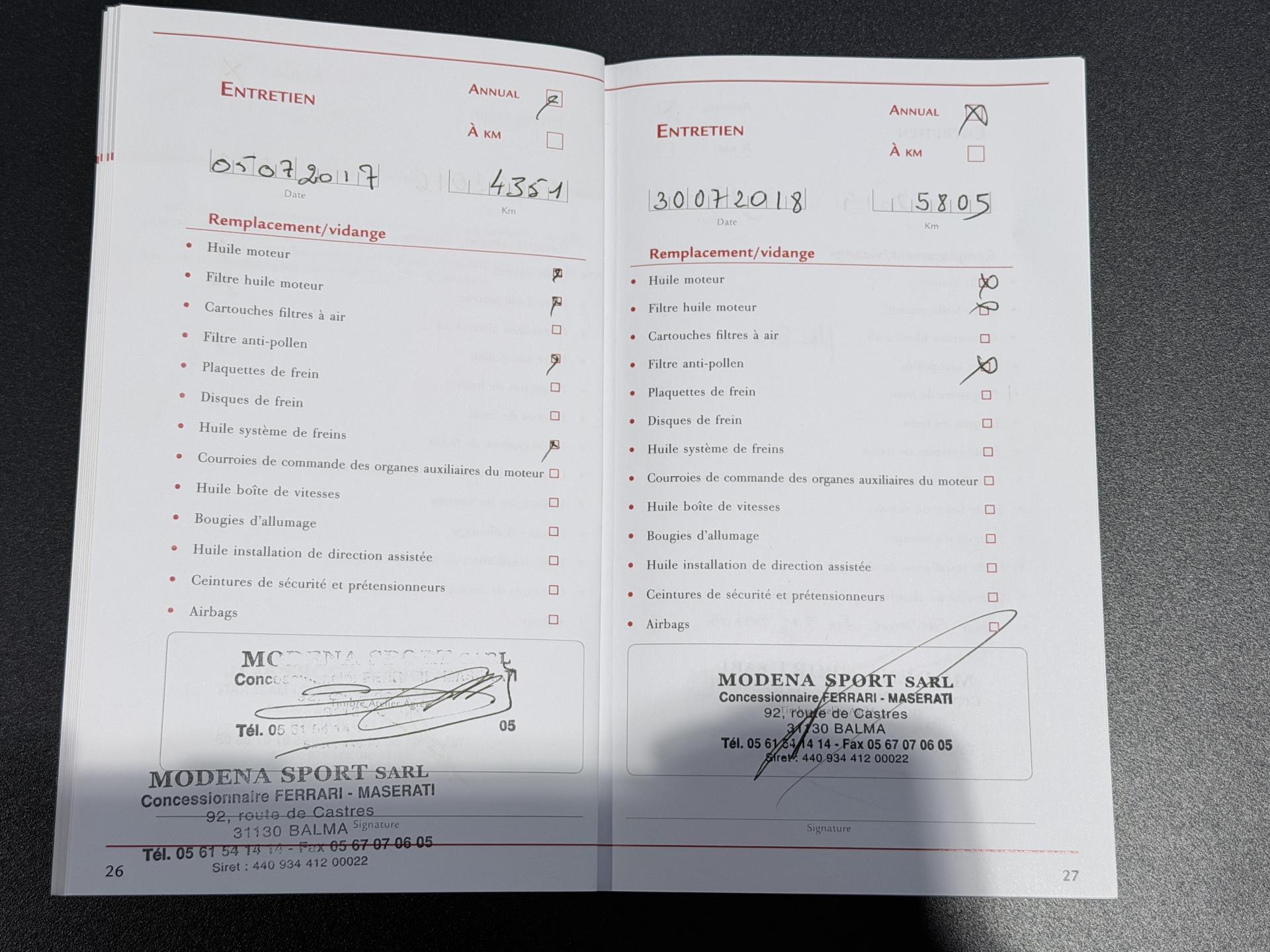 - 3ème entretien fait le 30/07/2018 à 5 805Km chez Ferrari Toulouse. ( Vidange moteur + filtre anti-pollen )