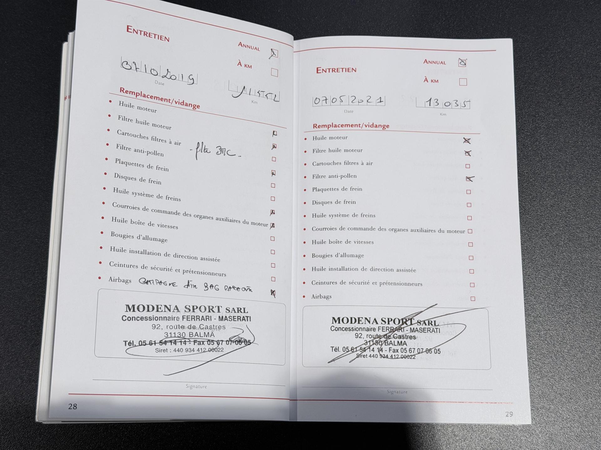 - 5ème entretien fait le 07/05/2021 à 13 055Km chez Ferrari Toulouse. ( Vidange moteur + filtre anti-pollen )