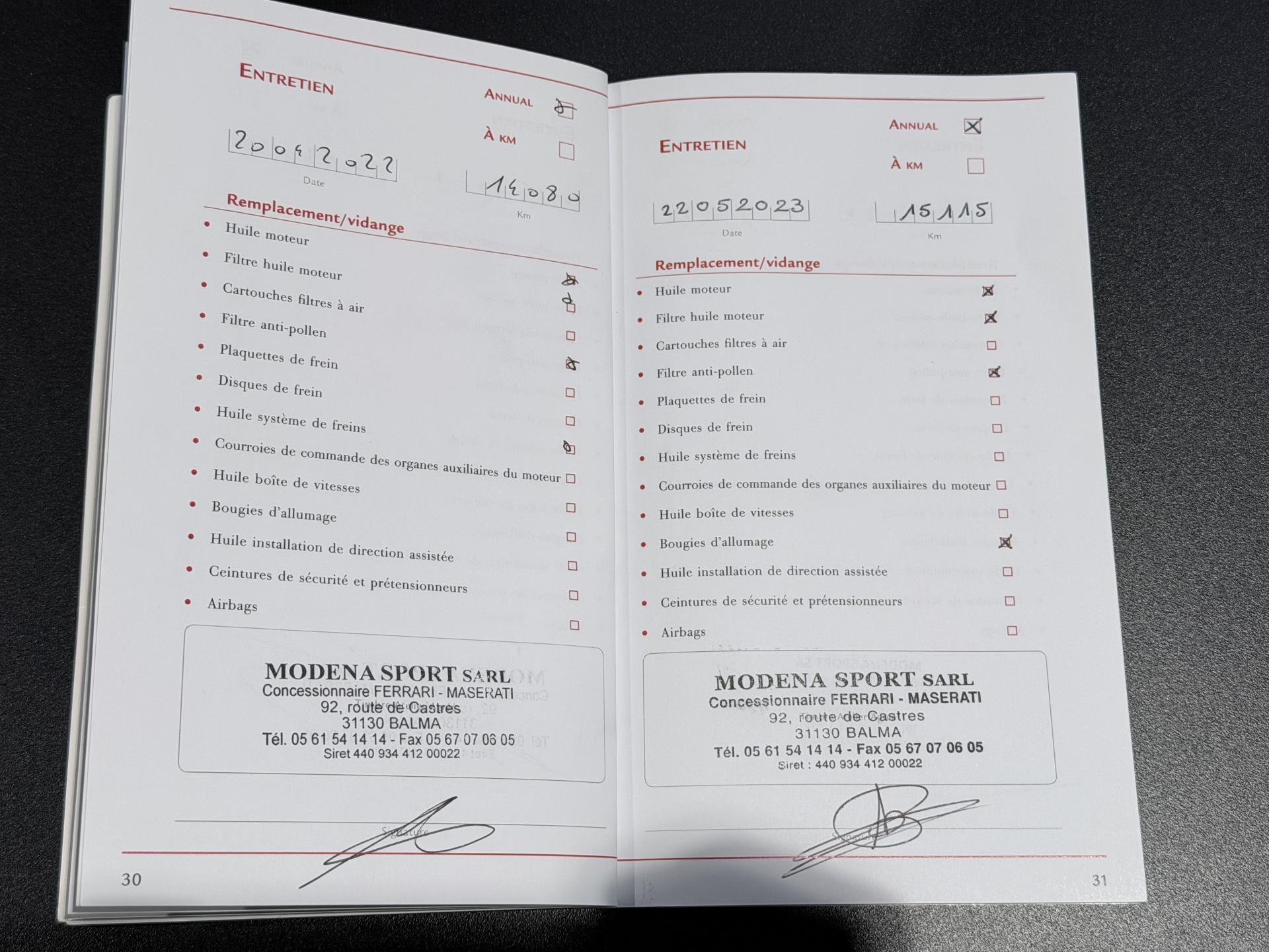 - 7ème entretien fait le 22/05/2023 à 15 115Km chez Ferrari Toulouse. ( Vidange moteur + filtre anti-pollen + bougies d'allumage )