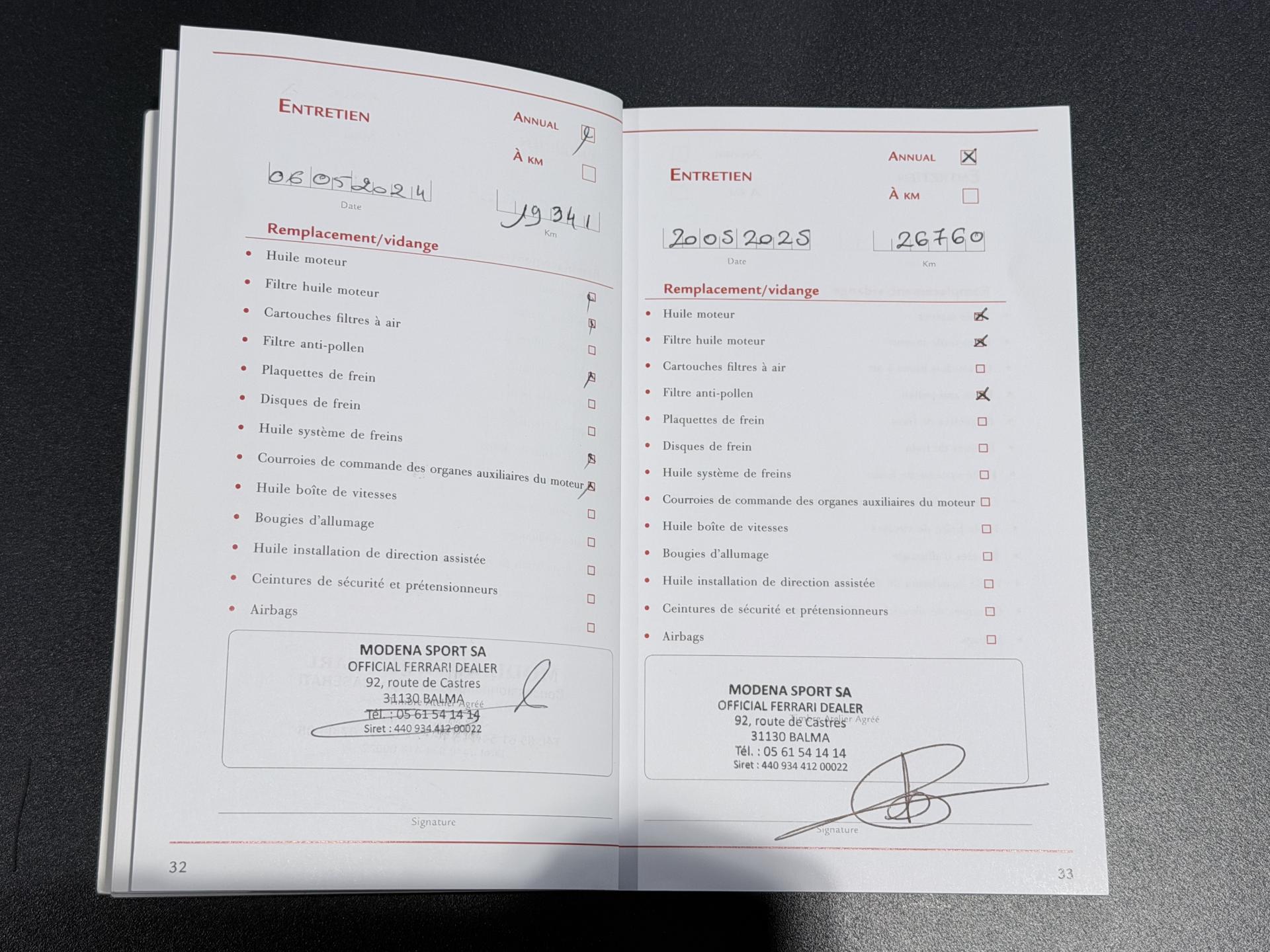 - 9ème entretien fait le 20/05/2025 à 26 760Km chez Ferrari Toulouse. ( Vidange moteur + filtre anti-pollen )
