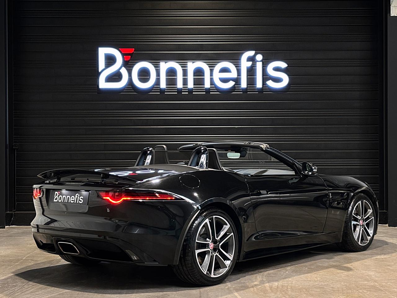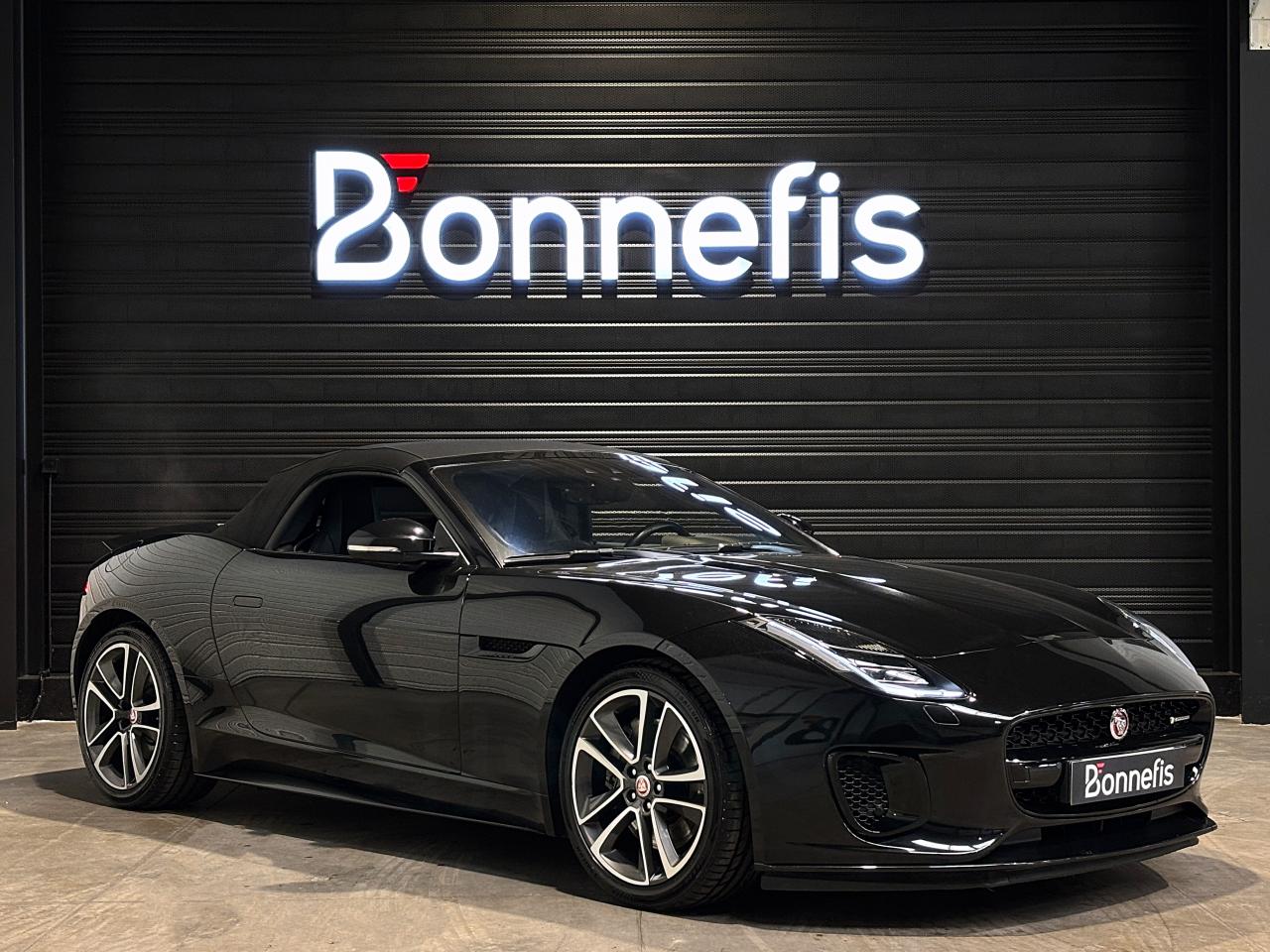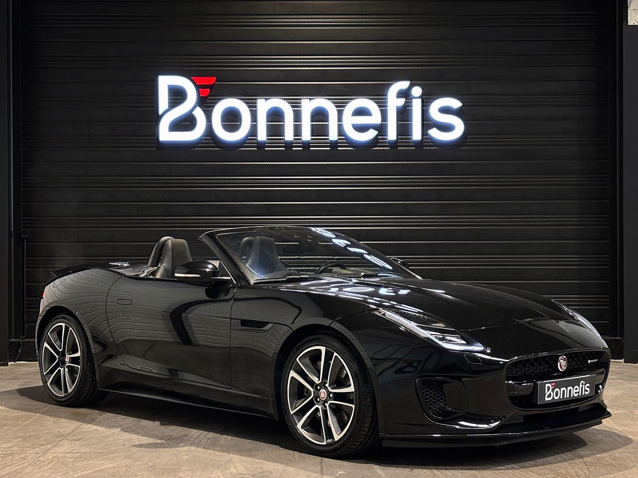 Jaguar F-Type Cabriolet 2.0 300Ch BVA8 R-Dynamic, 19 cv, extérieur Santorini black ( 1 135 € ), intérieur Jet, première mise en circulation le 26/01/2018.