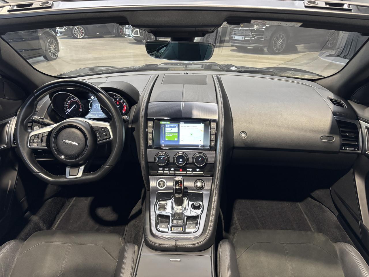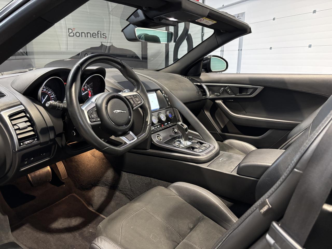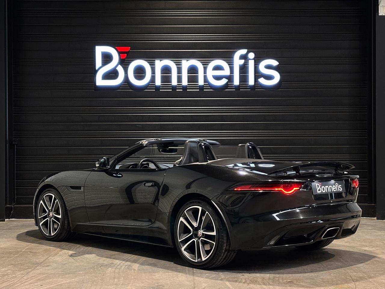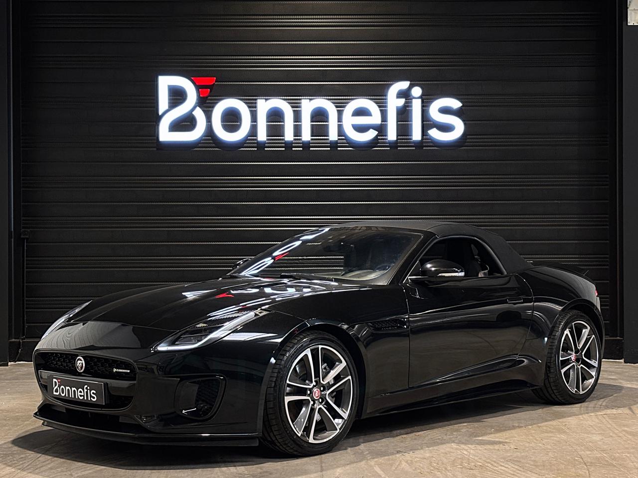 Jaguar F-Type Cabriolet 2.0 300Ch BVA8 R-Dynamic, 19 cv, extérieur Santorini black ( 1 135 € ), intérieur Jet, première mise en circulation le 26/01/2018.