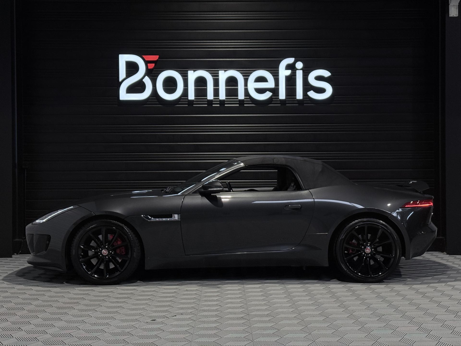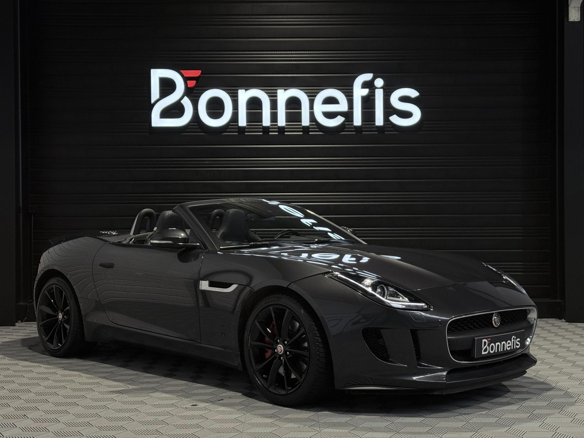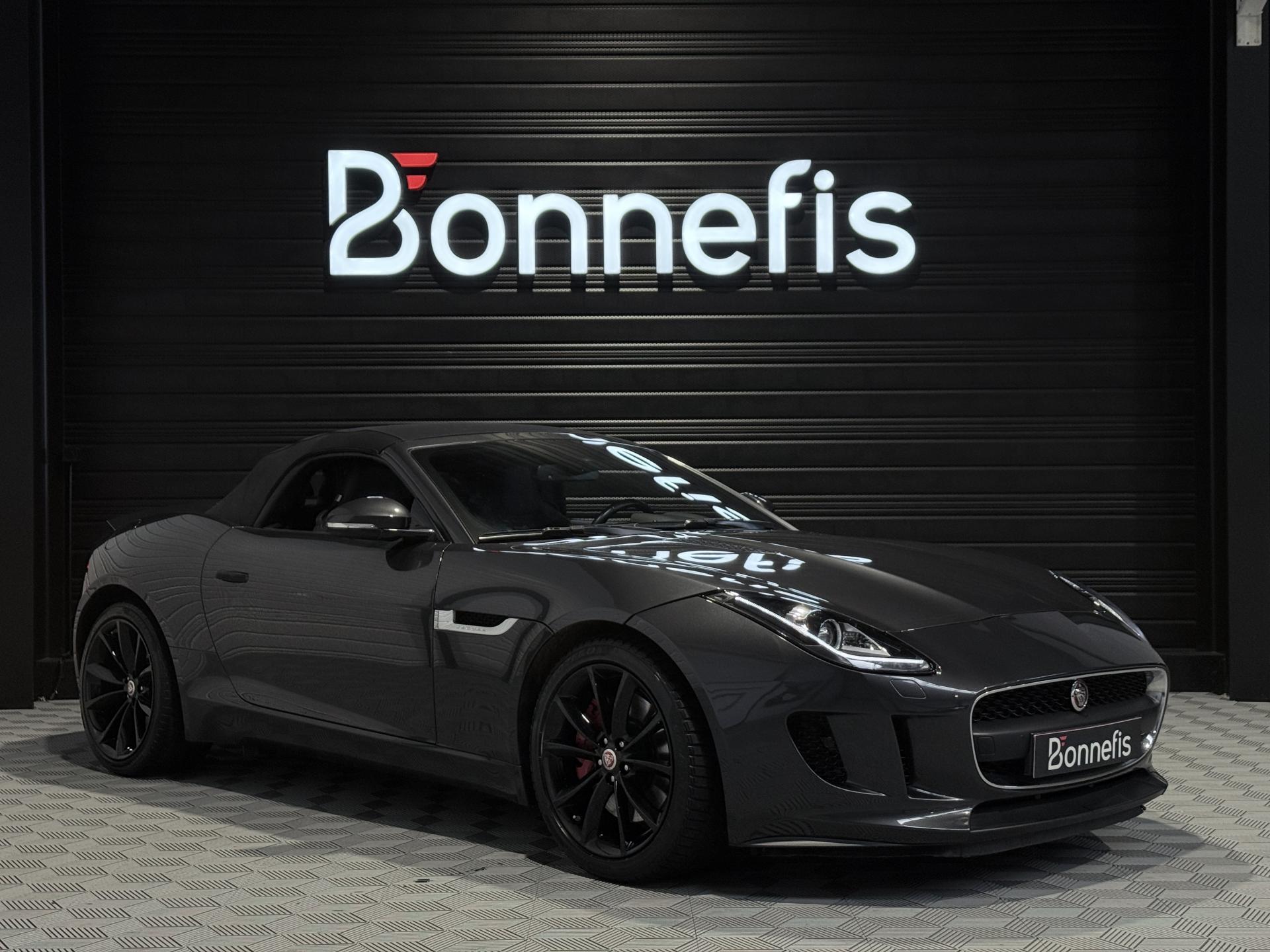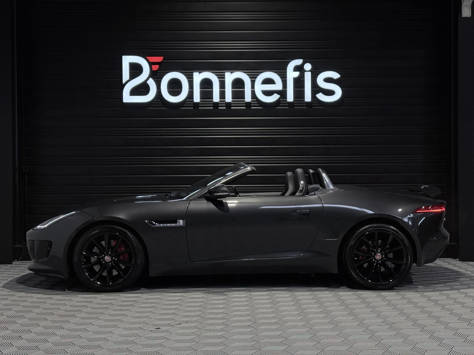 JAGUAR F-Type Cabriolet 3.0 V6 340Ch Essence Suralimenté BVA8, extérieur Gris ( Storm Grey métallisée ) ( 1 090 EUR ), intérieur Noir ( sellerie Performance habillés de cuir premium noir ) ( 2 420 EUR ), 23 cv, 2 portes, première mise en circulation le 30/06/2015.