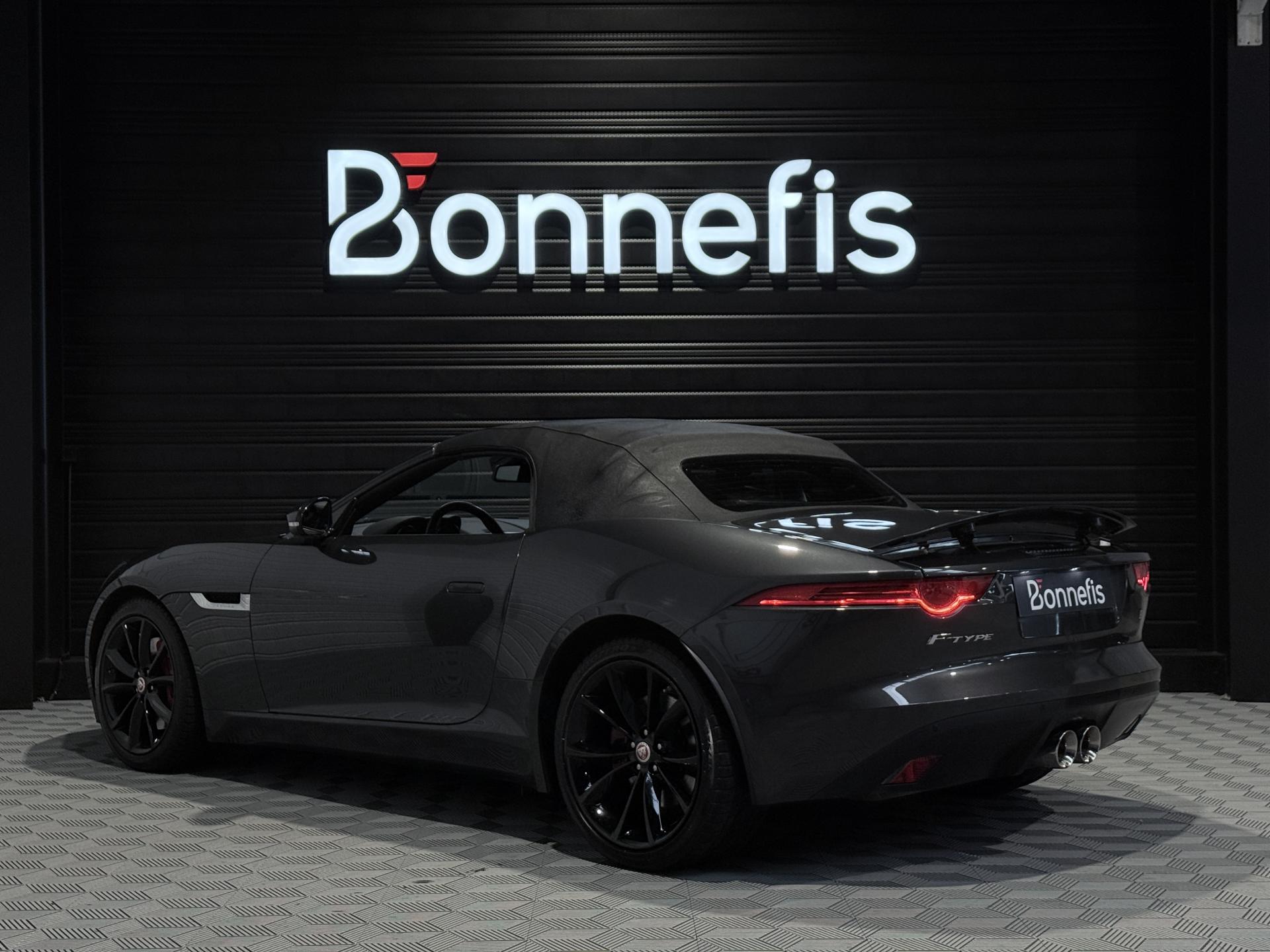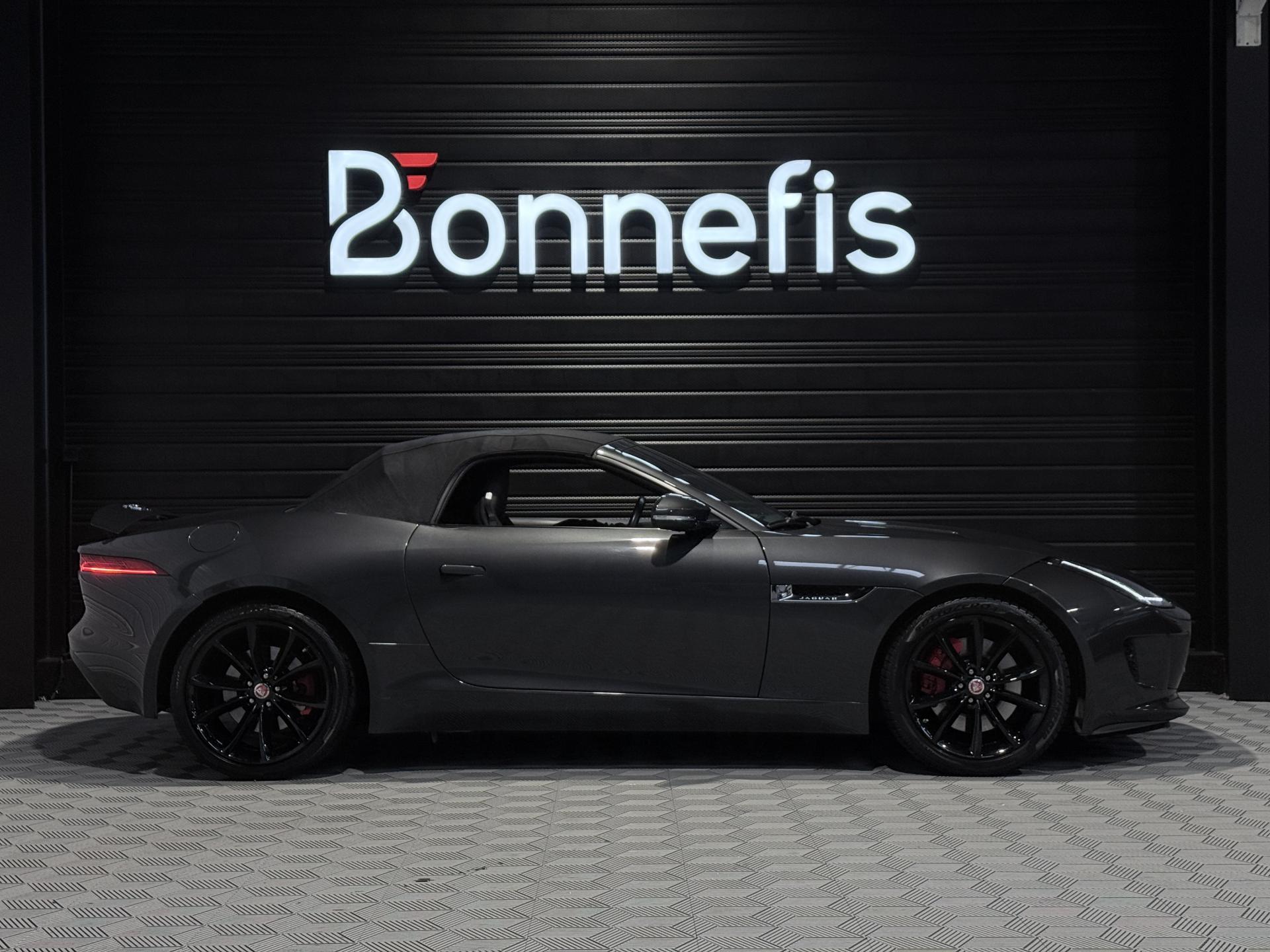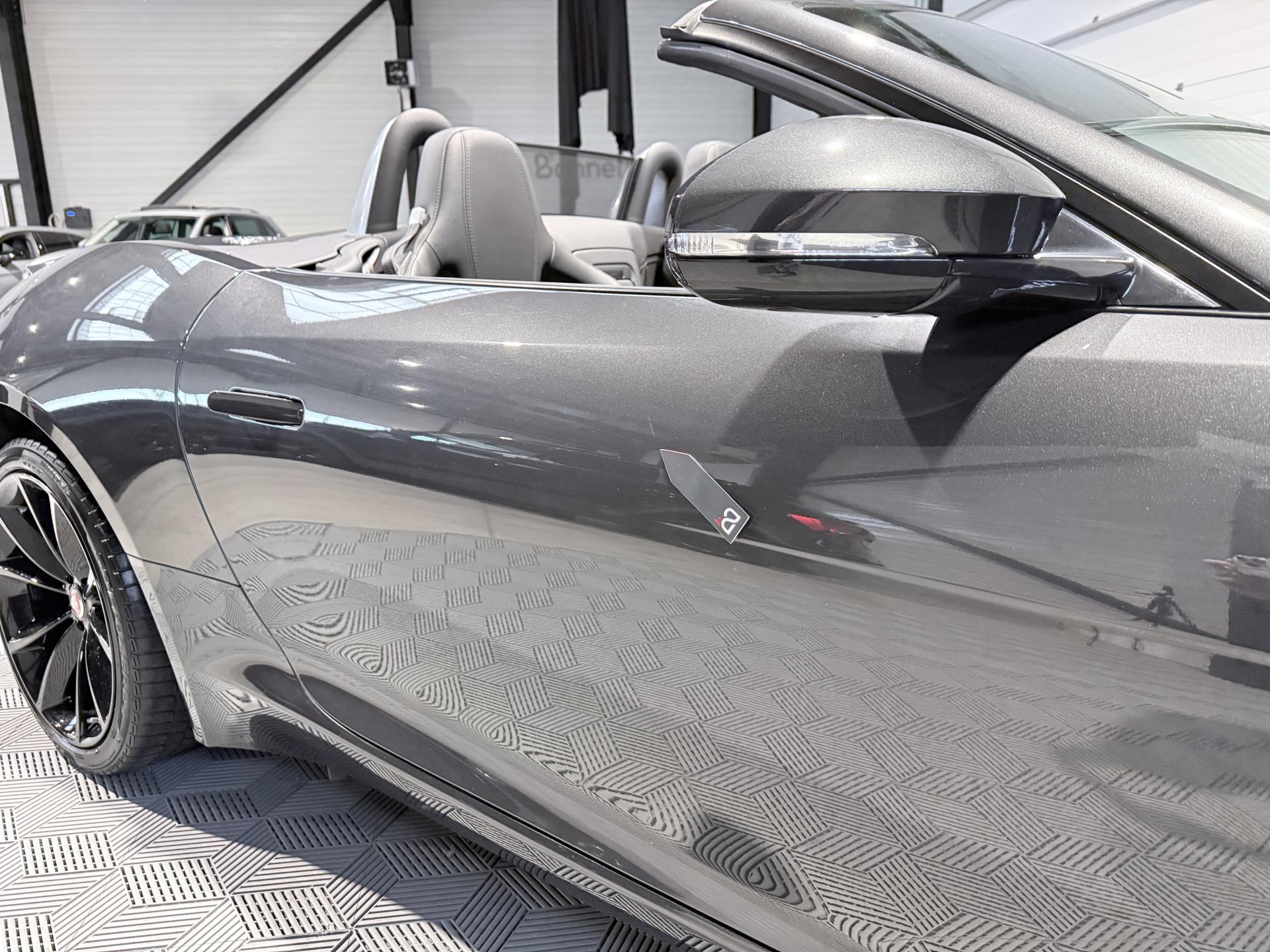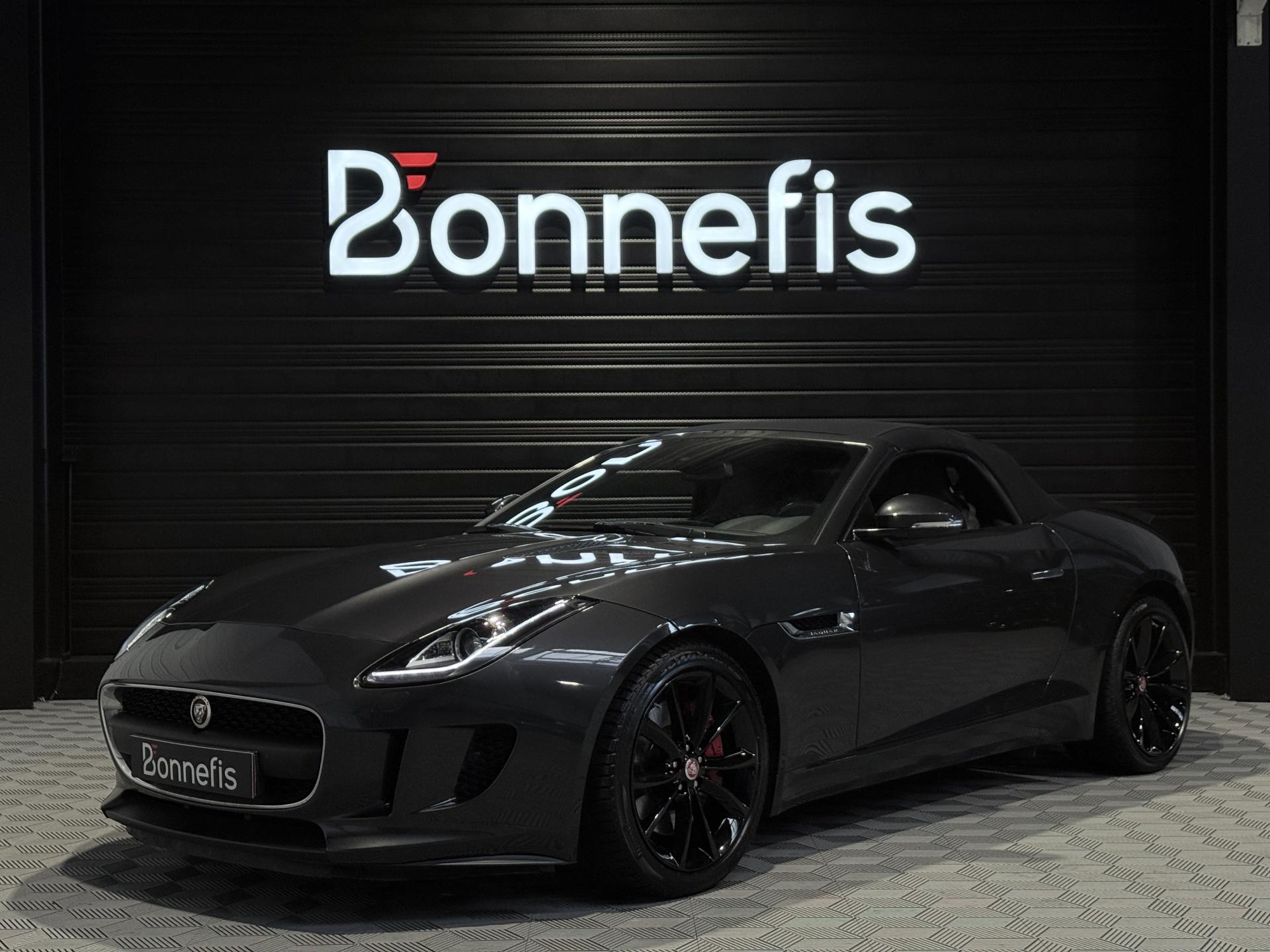 JAGUAR F-Type Cabriolet 3.0 V6 340Ch Essence Suralimenté BVA8, extérieur Gris ( Storm Grey métallisée ) ( 1 090 EUR ), intérieur Noir ( sellerie Performance habillés de cuir premium noir ) ( 2 420 EUR ), 23 cv, 2 portes, première mise en circulation le 30/06/2015.
