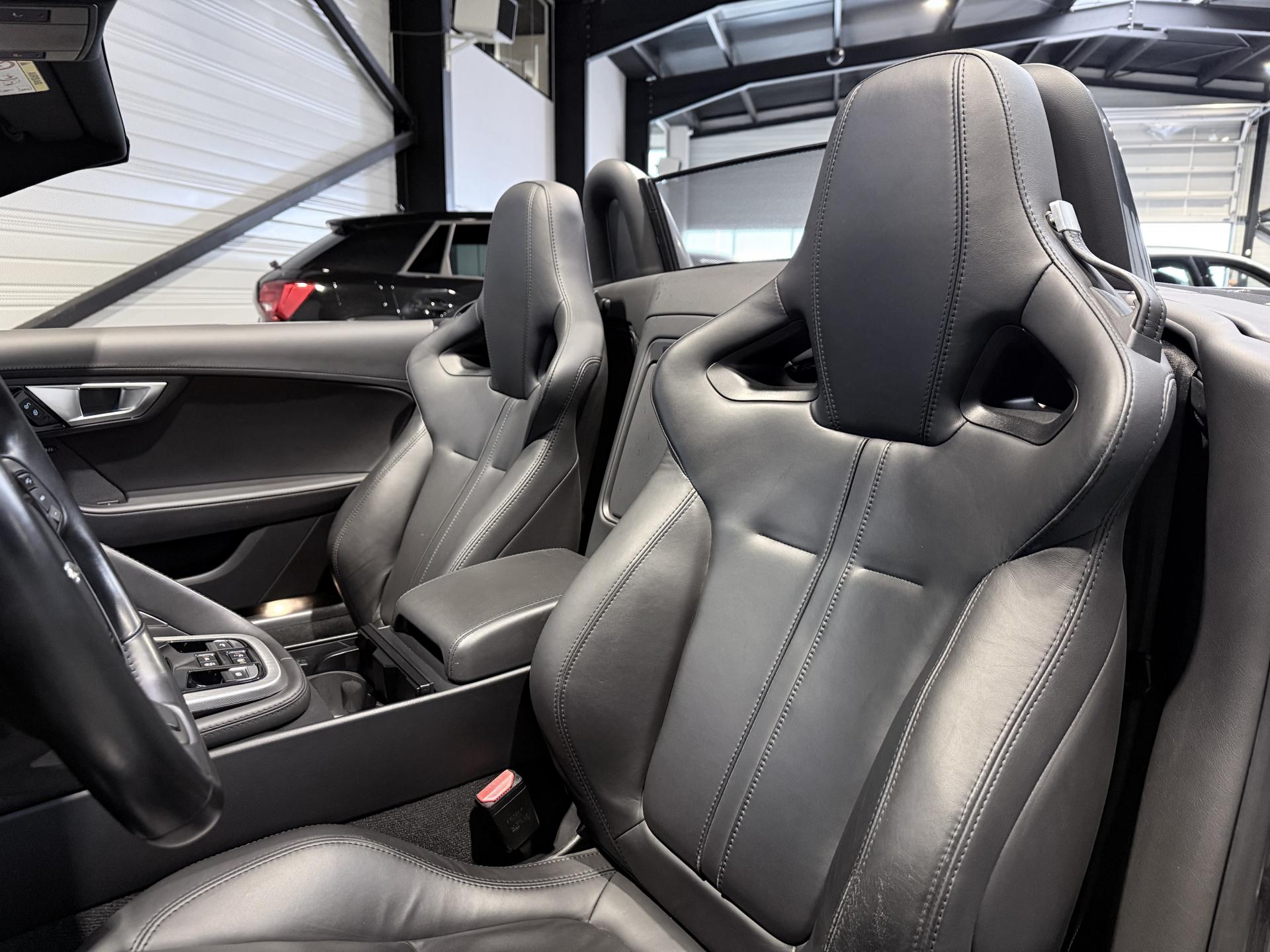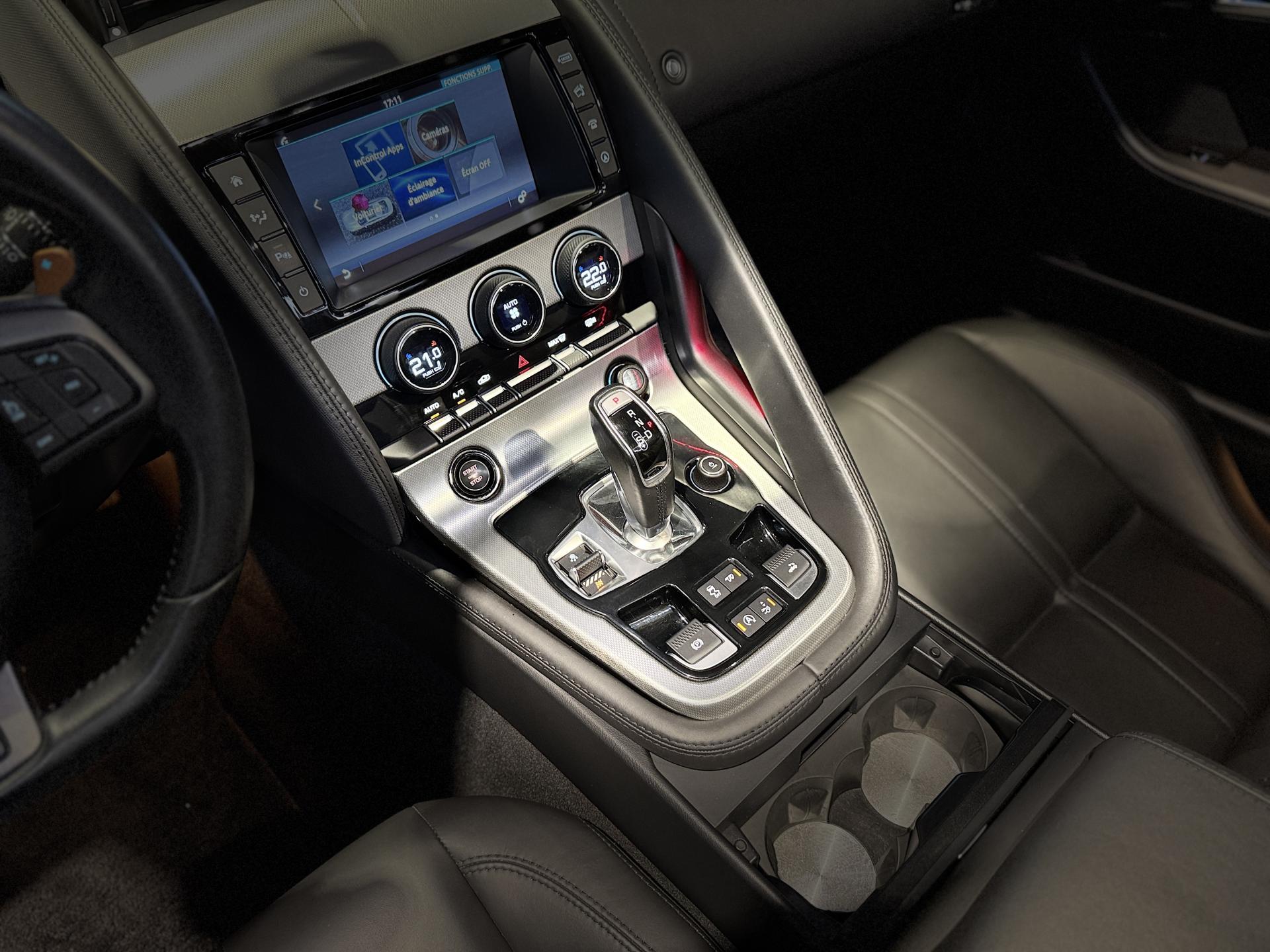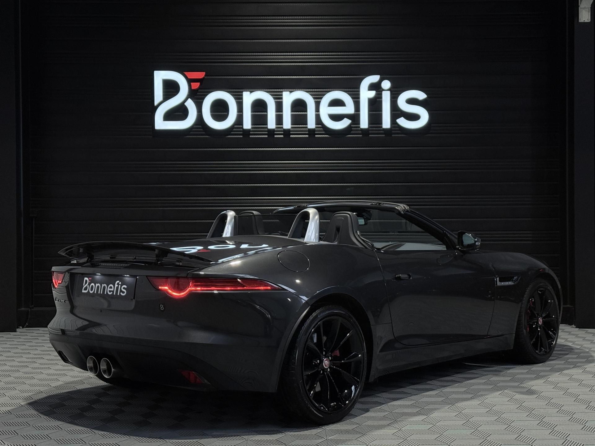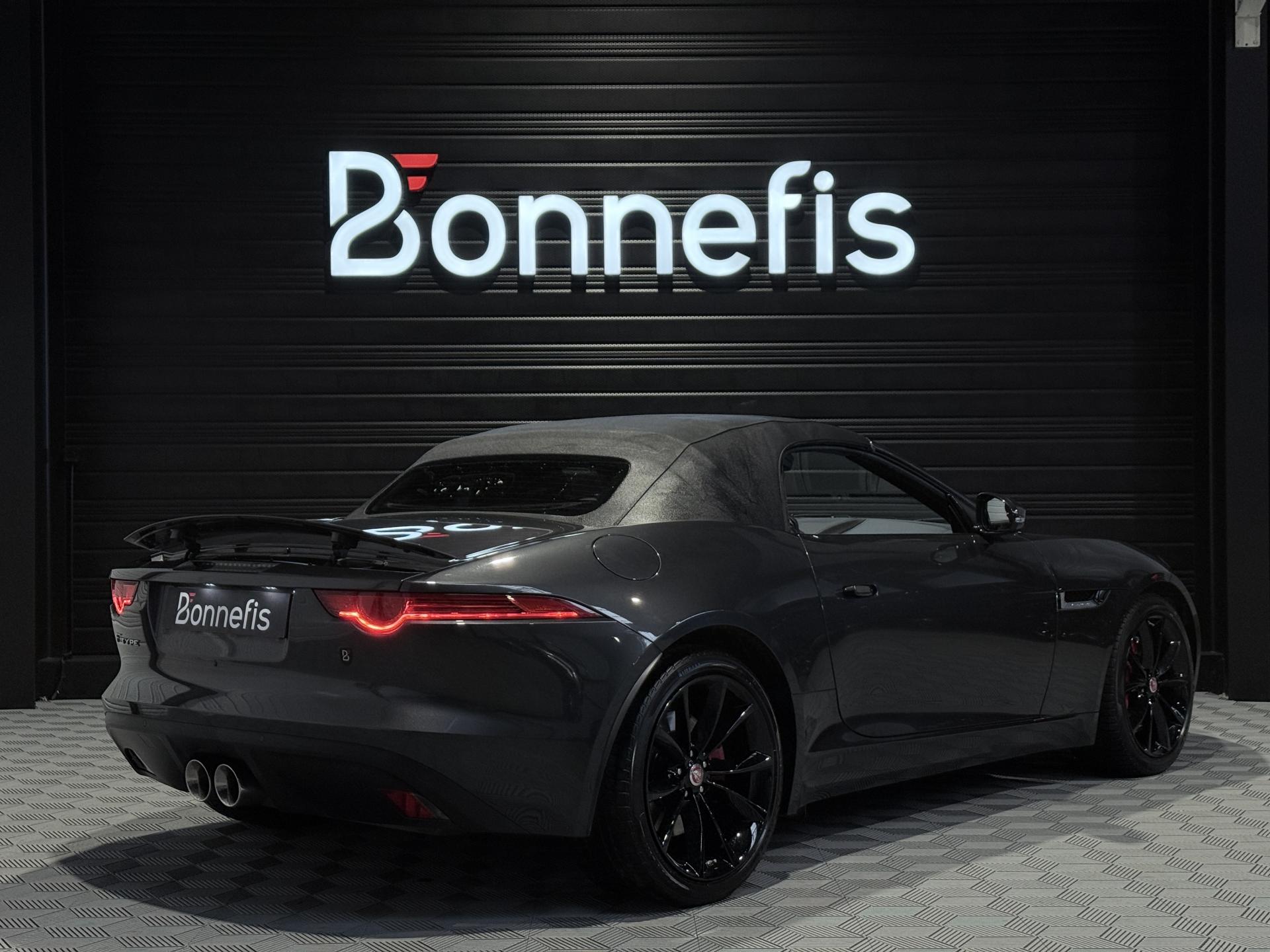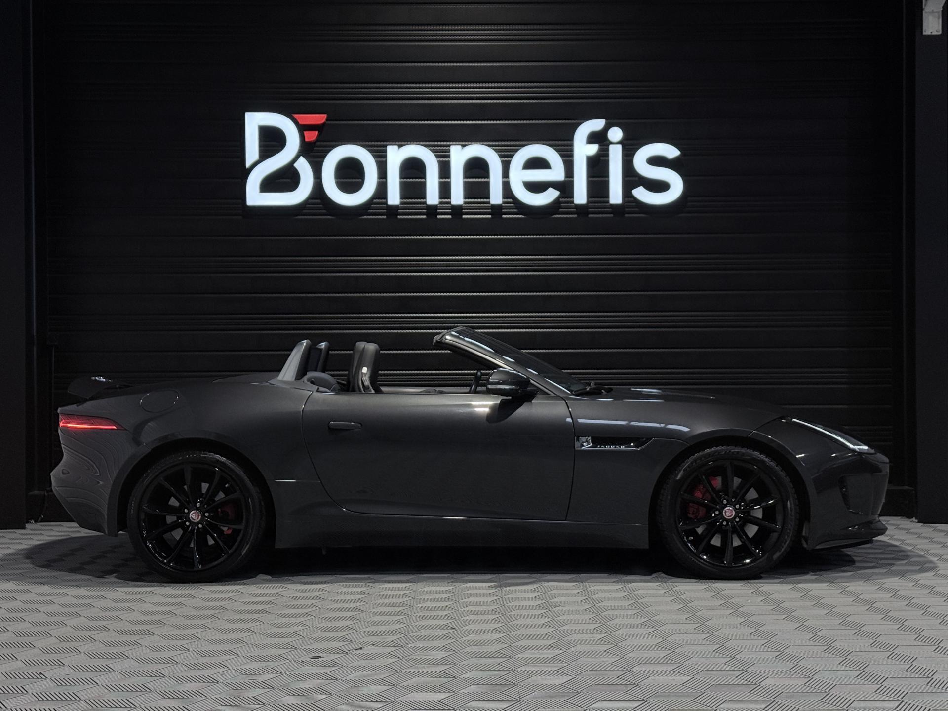 JAGUAR F-Type Cabriolet 3.0 V6 340Ch Essence Suralimenté BVA8, extérieur Gris ( Storm Grey métallisée ) ( 1 090 EUR ), intérieur Noir ( sellerie Performance habillés de cuir premium noir ) ( 2 420 EUR ), 23 cv, 2 portes, première mise en circulation le 30/06/2015.