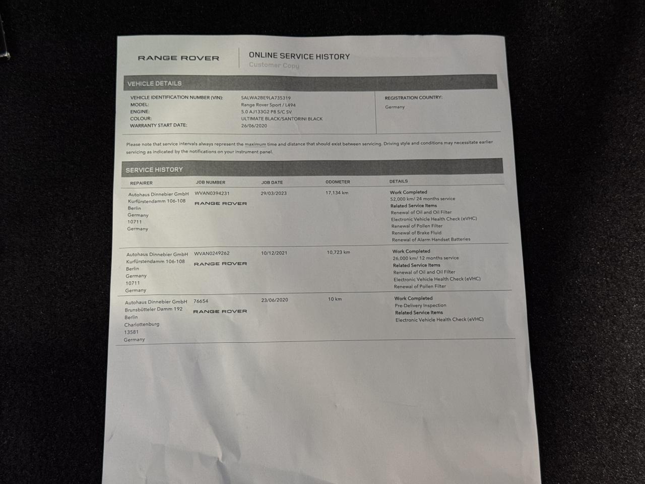 - 1er entretien fait le 23/06/2020 à 10Km chez Range Rover. ( Contrôle à la livraison )