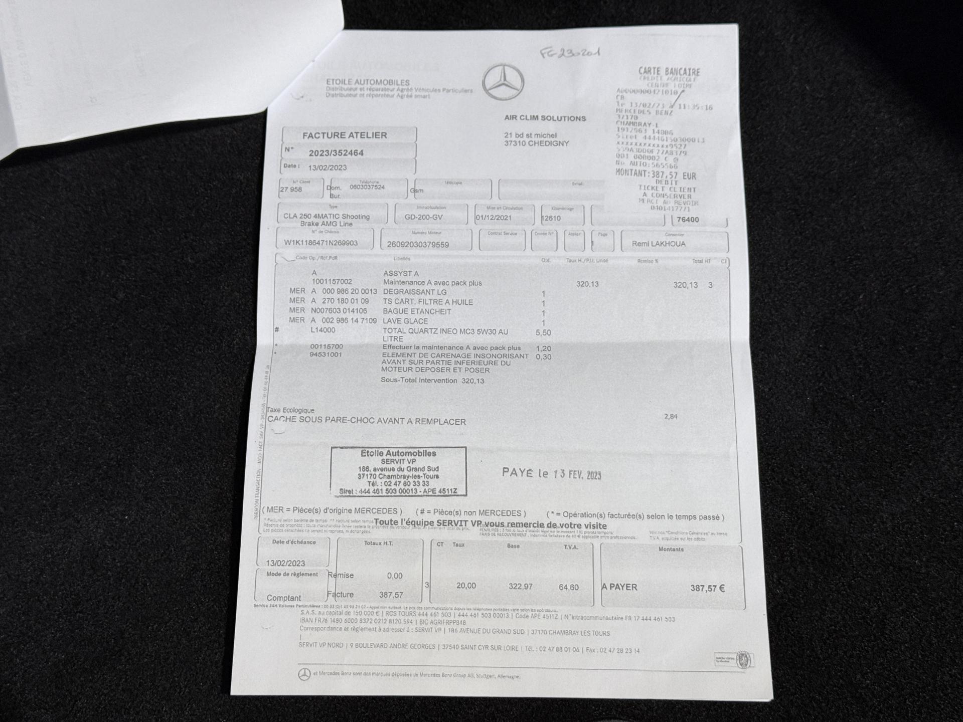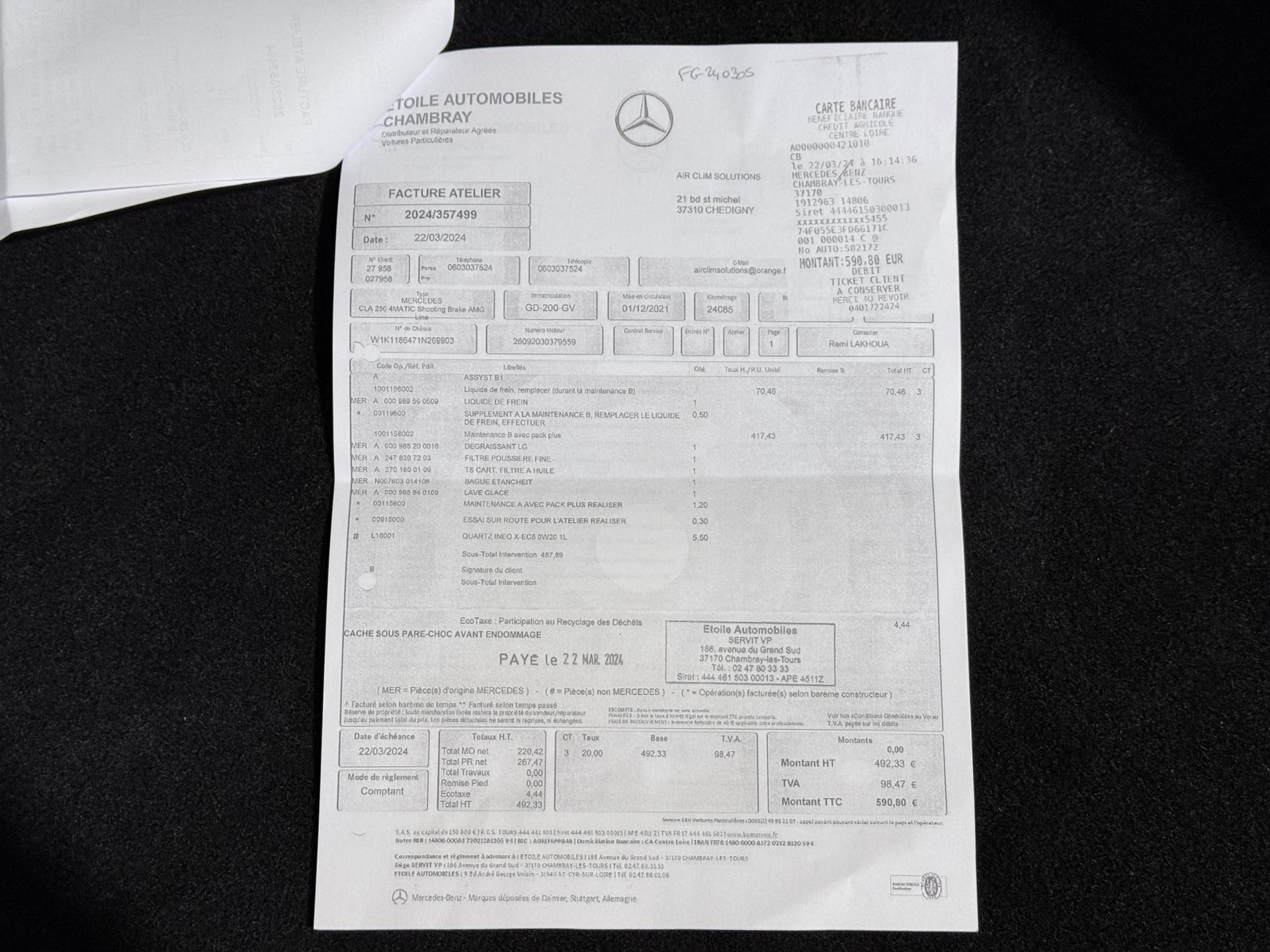 MERCEDES CLA Shooting Brake 250 7G-DCT 224Ch 4Matic AMG Line BVA, extérieur Blanc métallisée, intérieur cuir marron Bahia ( 1 000 € ), 13 cv, 5 portes, première mise en circulation le 01/12/2021.