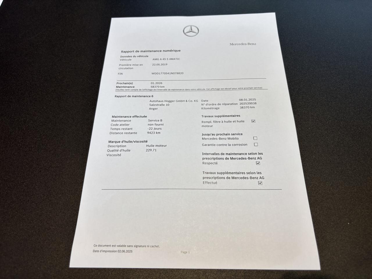 - 5ème entretien fait le 08/01/2025 à 38 370Km chez Mercedes. ( Vidange moteur )