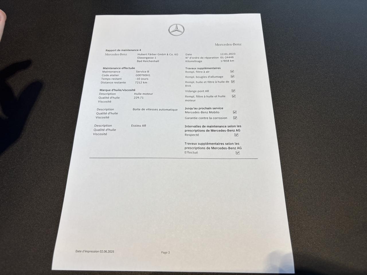 - 3ème entretien fait le 12/01/2023 à 17 858Km chez Mercedes. ( Vidange moteur + vidange du pont + vidange de la boite automatique + bougies + filtre à air )