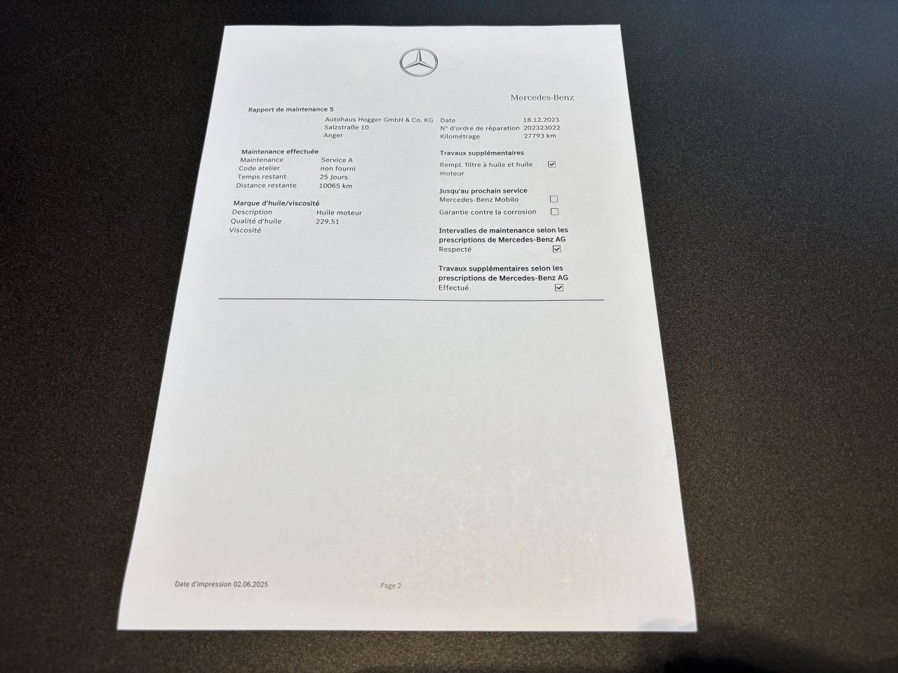 - 4ème entretien fait le 18/12/2023 à 27 793Km chez Mercedes. ( Vidange moteur )
