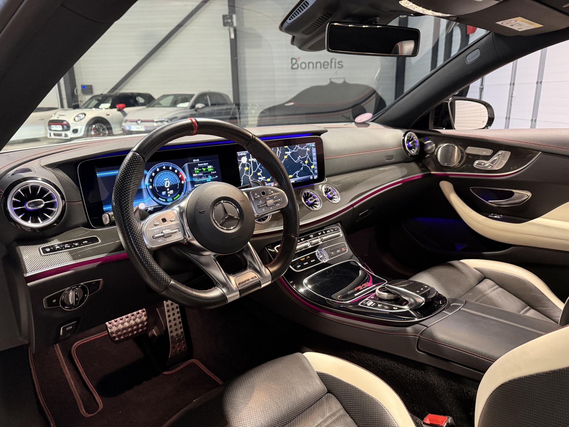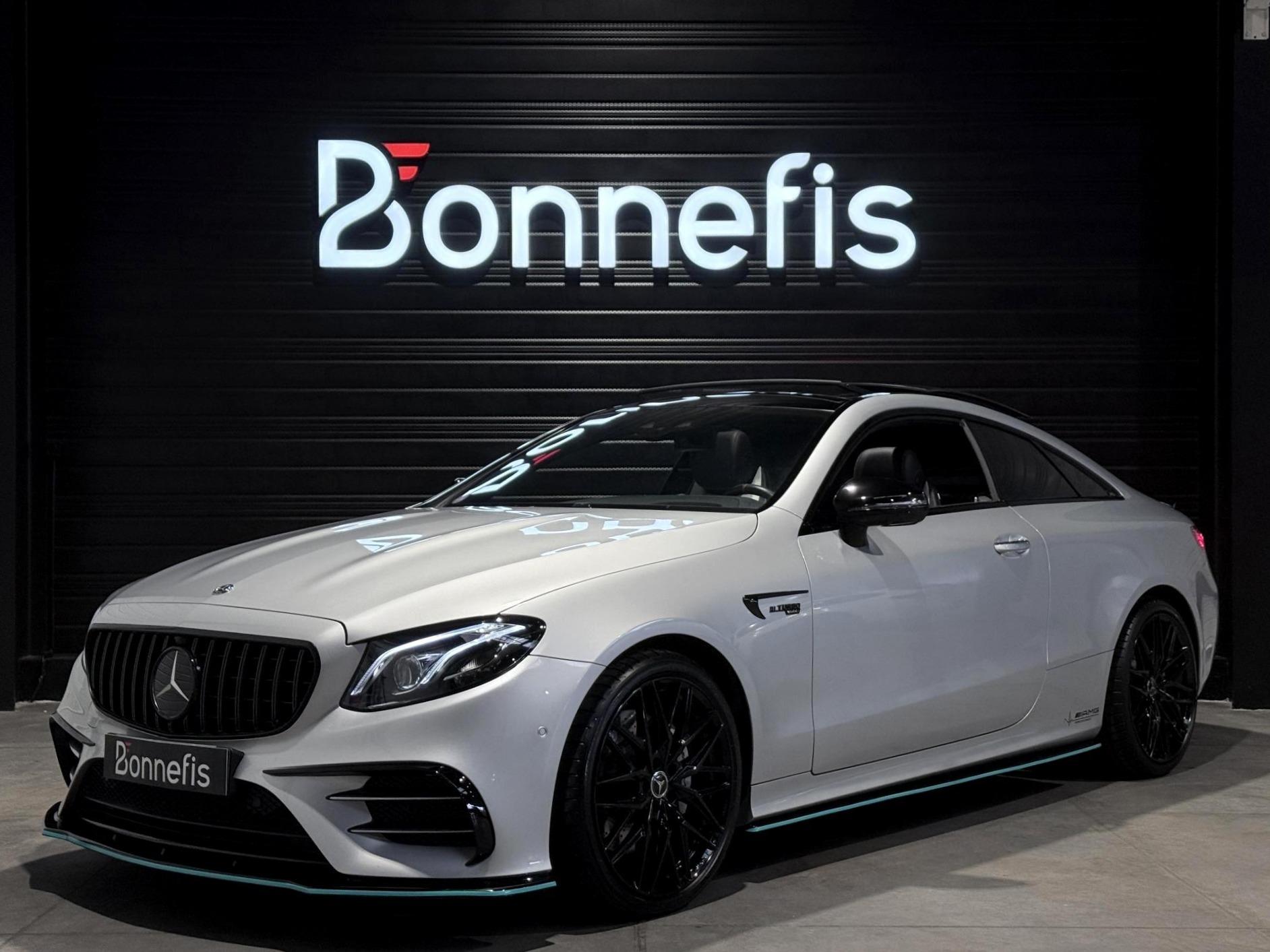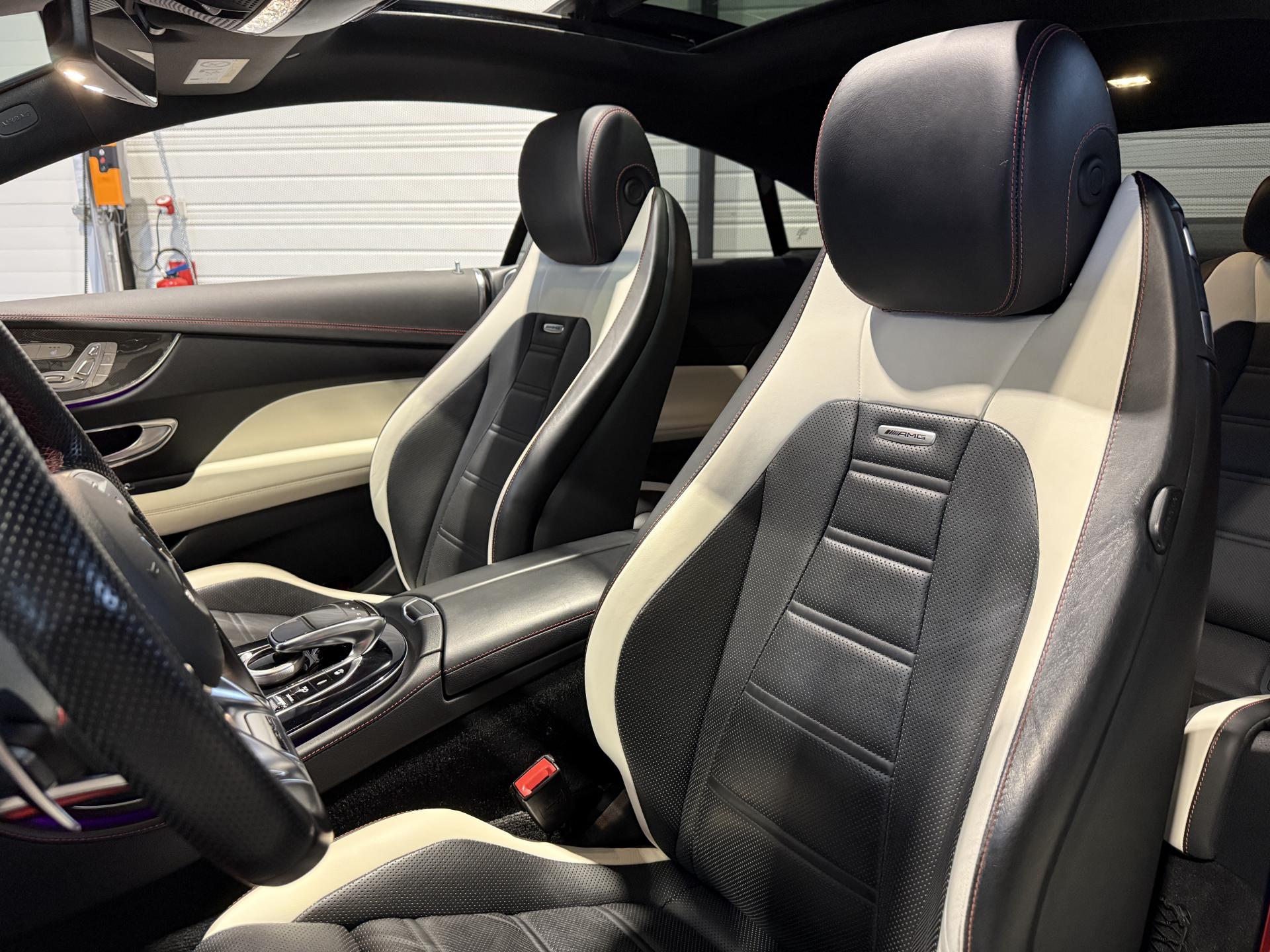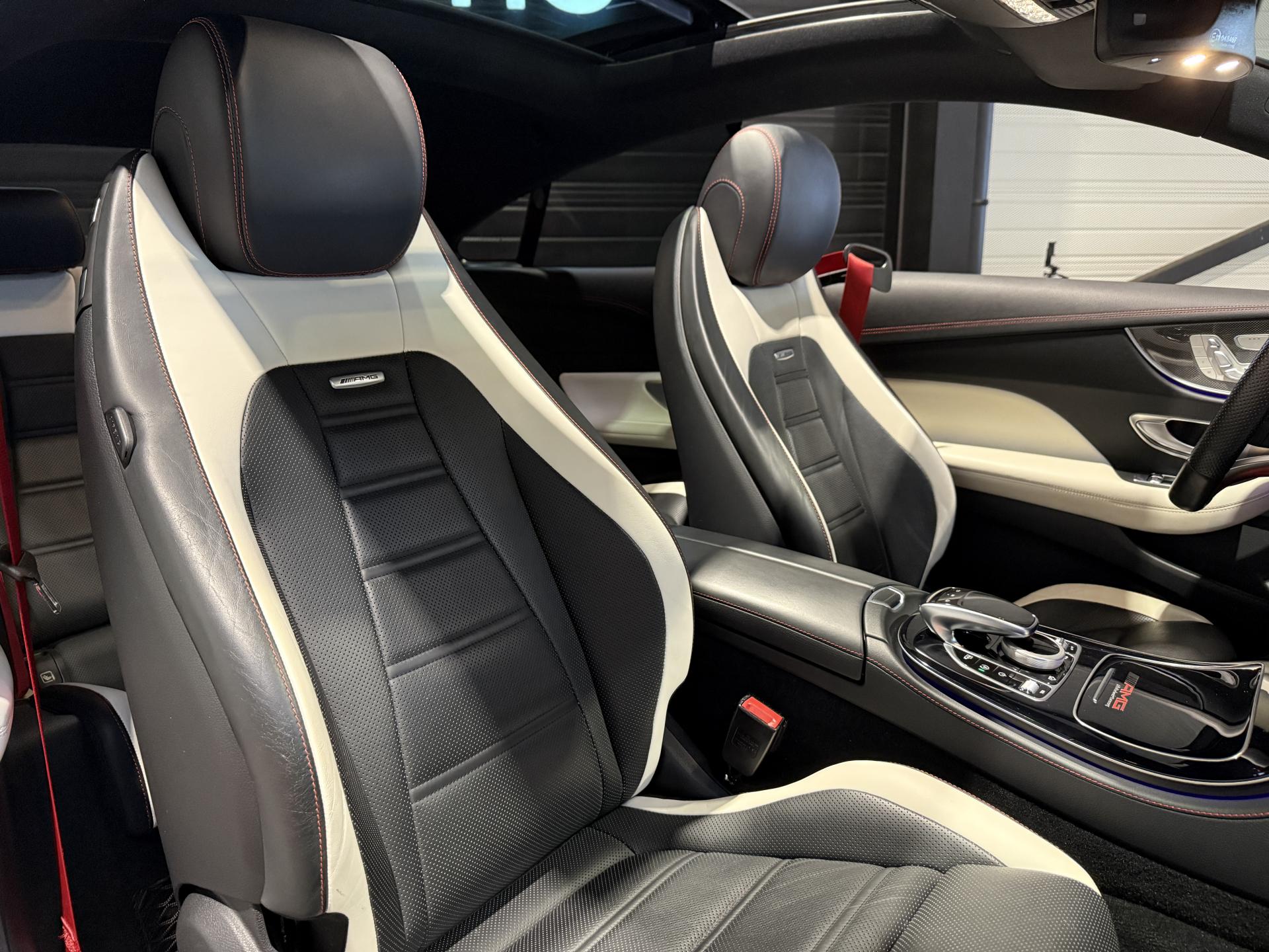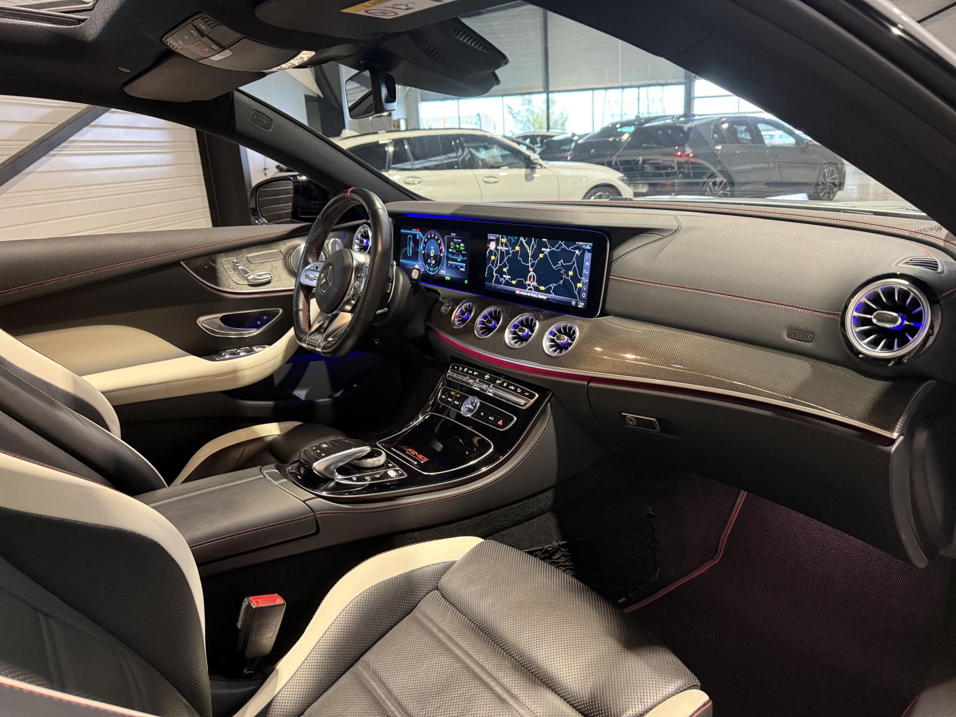 Mercedes Classe E53 AMG Coupé 3.0 457 Ch, extérieur gris métalisée, intrérieur bi-couleur cuir noir / blanc, 32 cv, 3 portes, première mise en circulation le 14/12/2018.