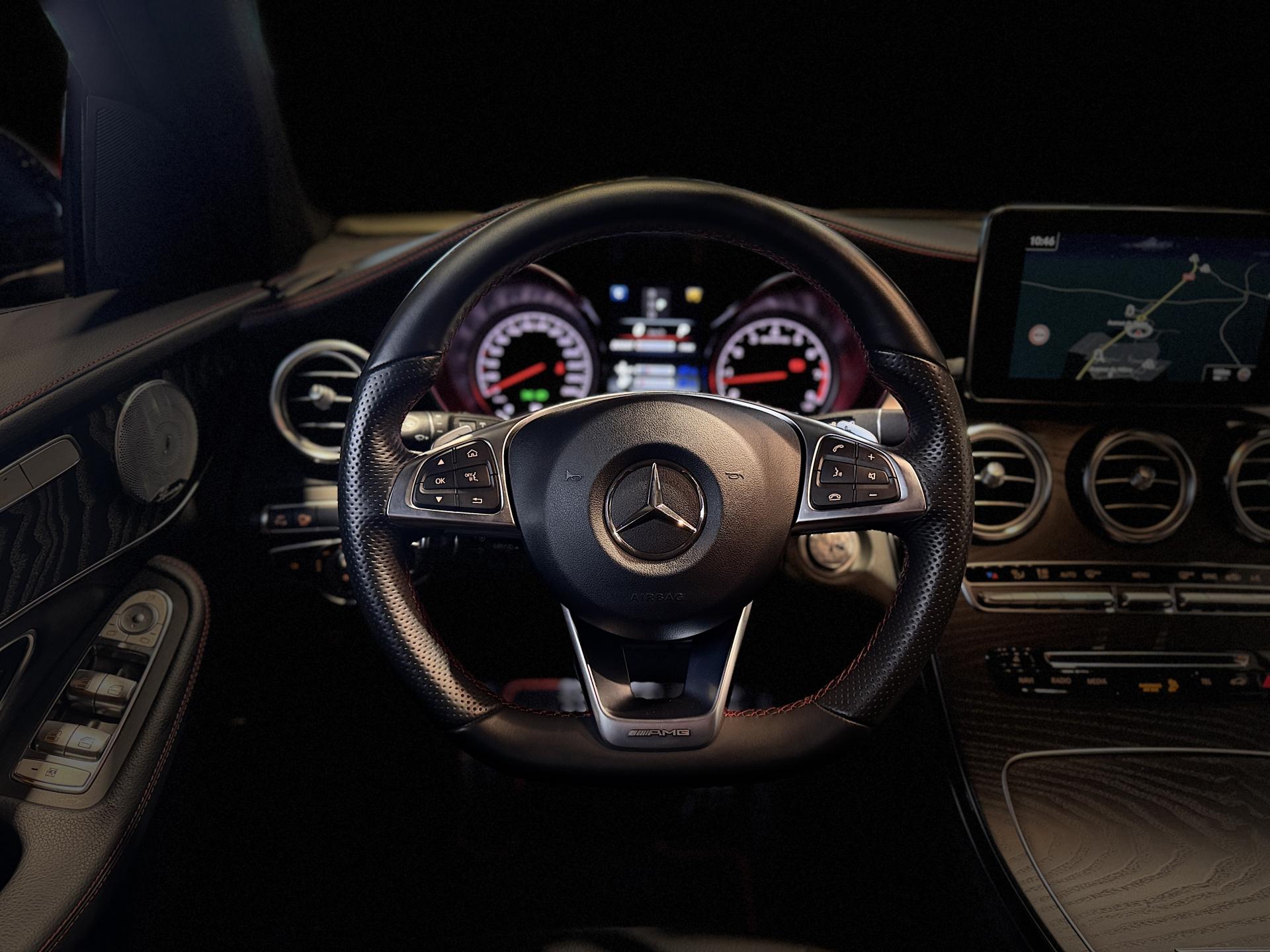 Nombreuses options : GPS, caméra de recul, radars avants et arrières de détection d'obstacles, COMMAND Online: système multimédia avec écran haute résolution couleur 21,3 cm (8.4"), navigation 3D ( 1 916 € ), Système de sonorisation Surround Burmester ( 833 € ), Intelligent Light System (ILS) à LED : projecteurs hautes performances à technologie LED avec répartition variable de l'éclairage, éclairage actif dans les virages et correcteur dynamique de portée ( 583 € ), Inserts décoratifs en frêne noir ( 291 € ), Lave-glace chauffant ( 208 € ), Pack Sport Black en liaison avec le Pack AMG Line ( 208 € ), Remote Online ( 166 € ), Assistant de feux de route Plus ( 125 € ), Boîte de vitesses automatique à 9 rapports 9G-TRONIC avec fonction "Stop/Start ECO" (DYNAMIC SELECT et TEMPOMAT (régulateur de vitesse) et SPEEDTRONIC (limiteur de vitesse) inclus), Fonction de démarrage sans clé KEYLESS-GO, Hayon EASY-PACK avec ouverture et fermeture par commande électrique, Pilote automatique de stationnement avec caméras 360°, Pilote automatique de stationnement avec Parktronic, Rétroviseurs extérieur rabattables électriquement, Ciel de pavillon en tissu noir, Climatisation automatique THERMATIC à 2 zones, Contrôle de la pression des pneumatiques, Double sortie d'échappement chromée, Rampe de toit noir, Sièges AV chauffants, Touchpad: Pavé tactile permettant la navigation dans les menus, Vitres latérales AR et lunette AR en verre teinté foncé, ...