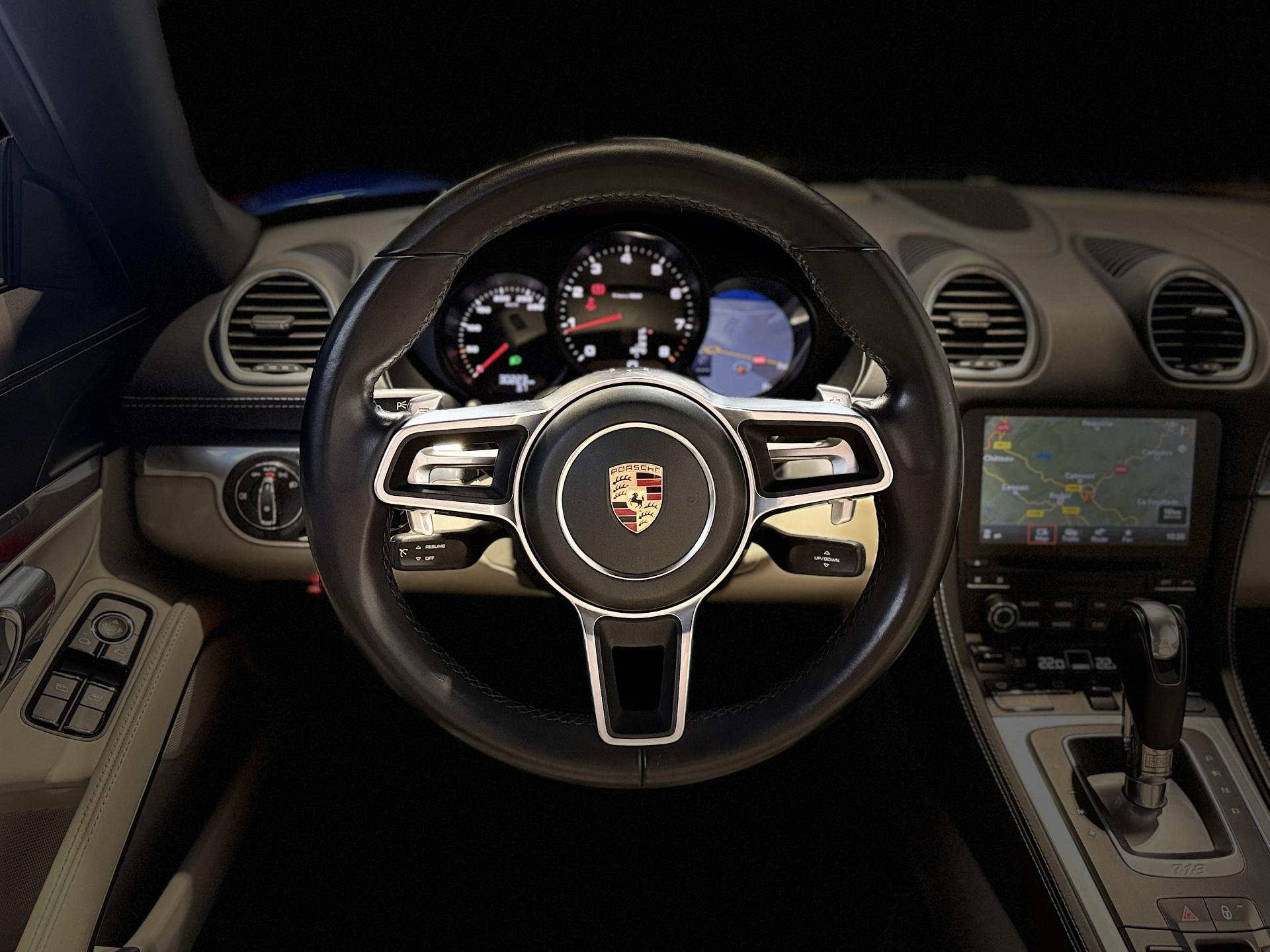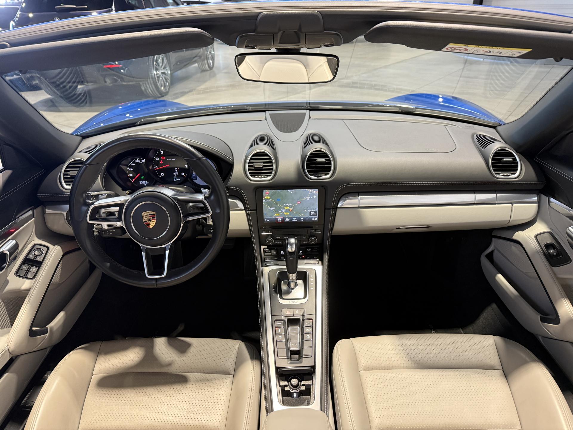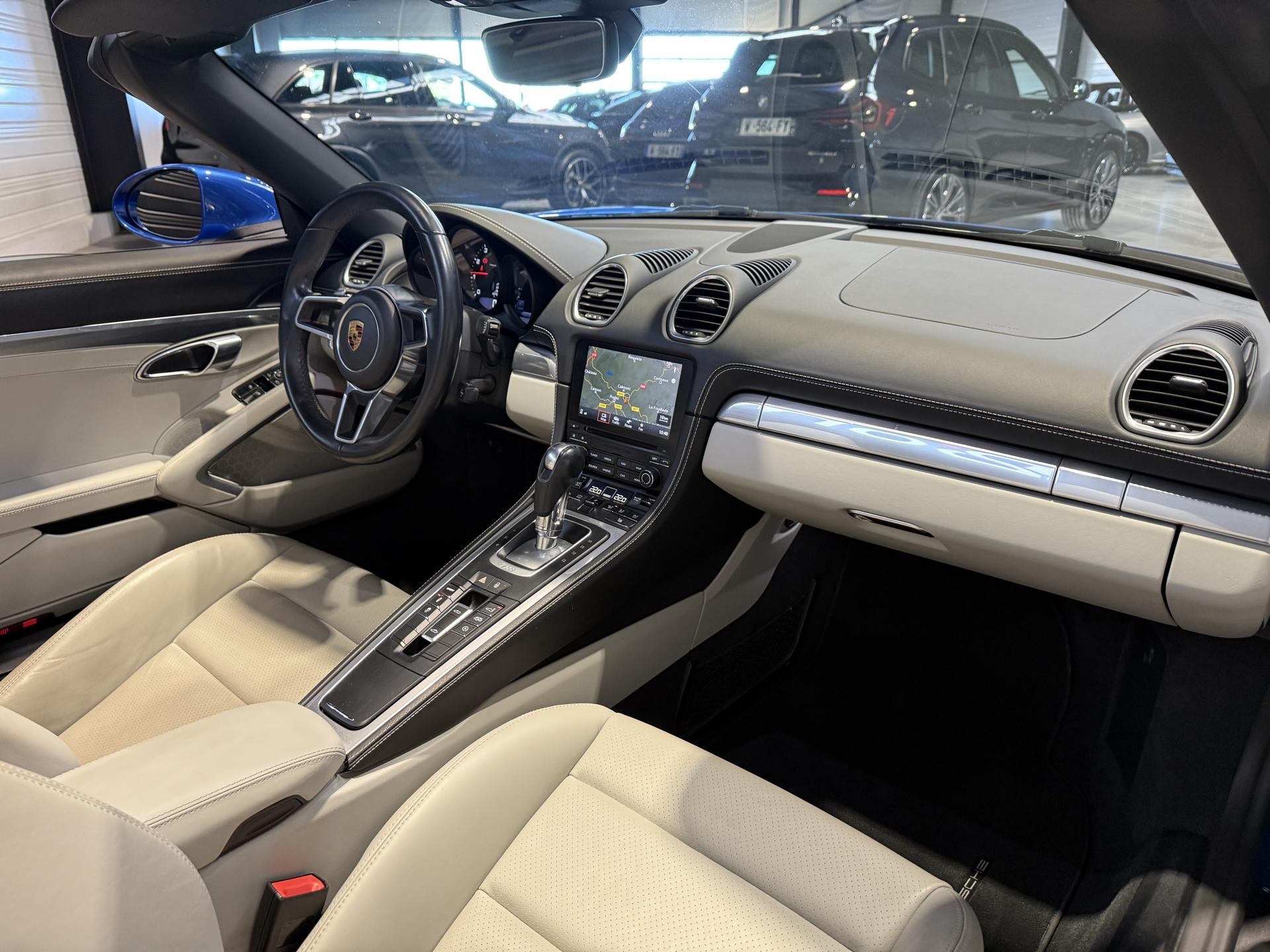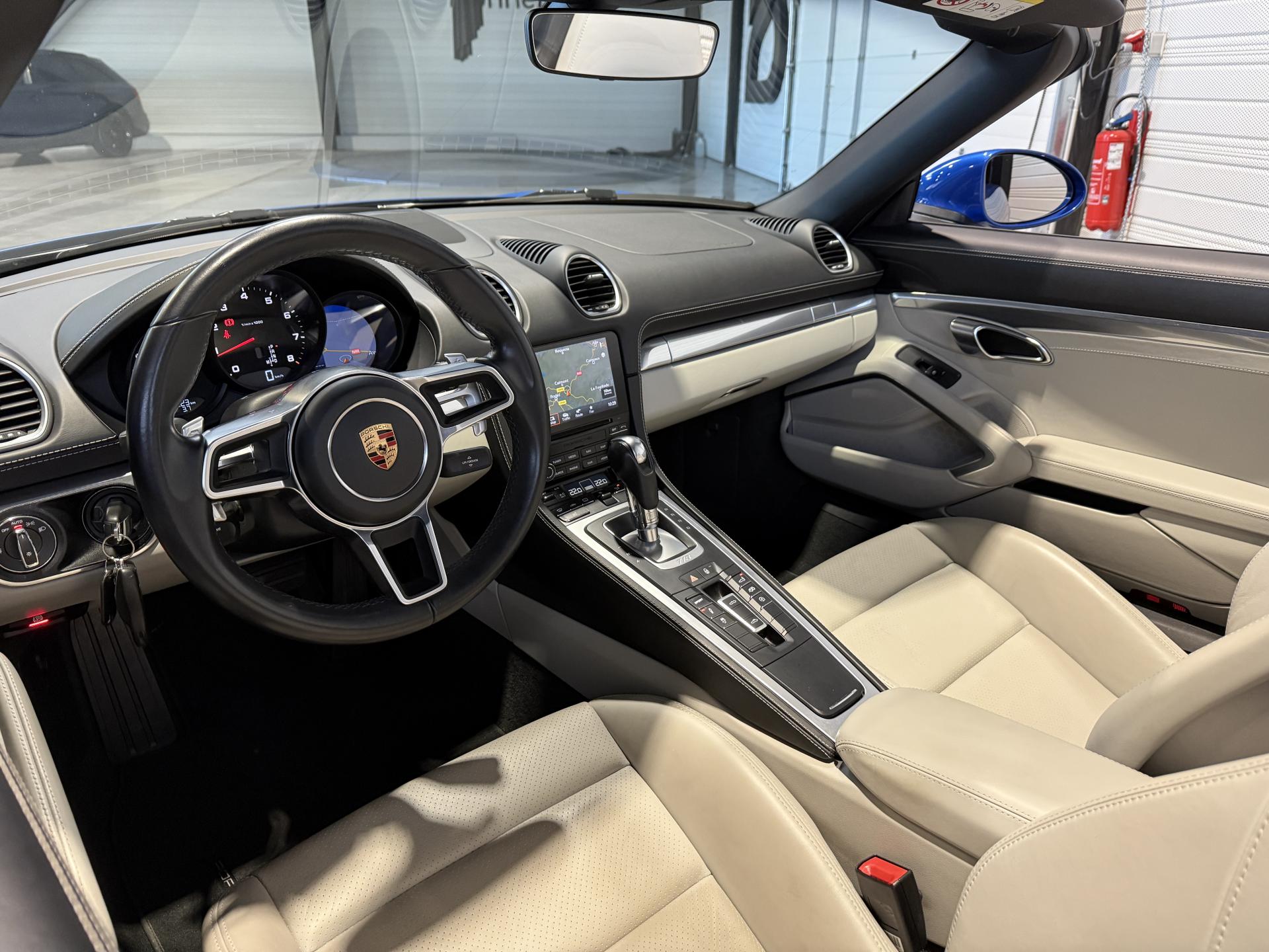 Porsche 718 Boxster 2.0 300 Ch BVA PDK cabriolet, extérieur bleu saphir métallisée, intérieur cuir bicolore Noir / Craie ( 3 590 € ), 19 cv, 2 portes, première mise en circulation le 23/03/2017.