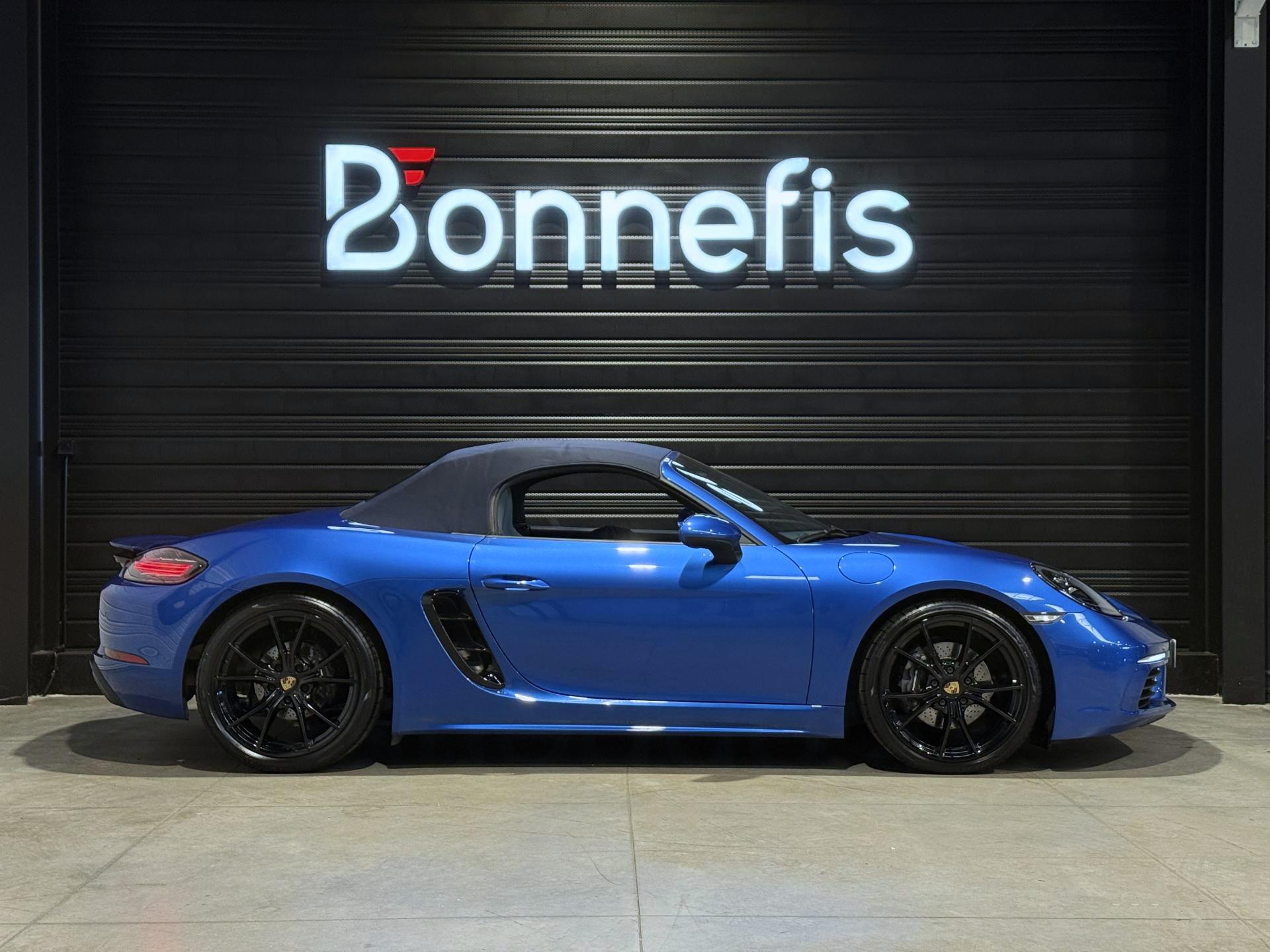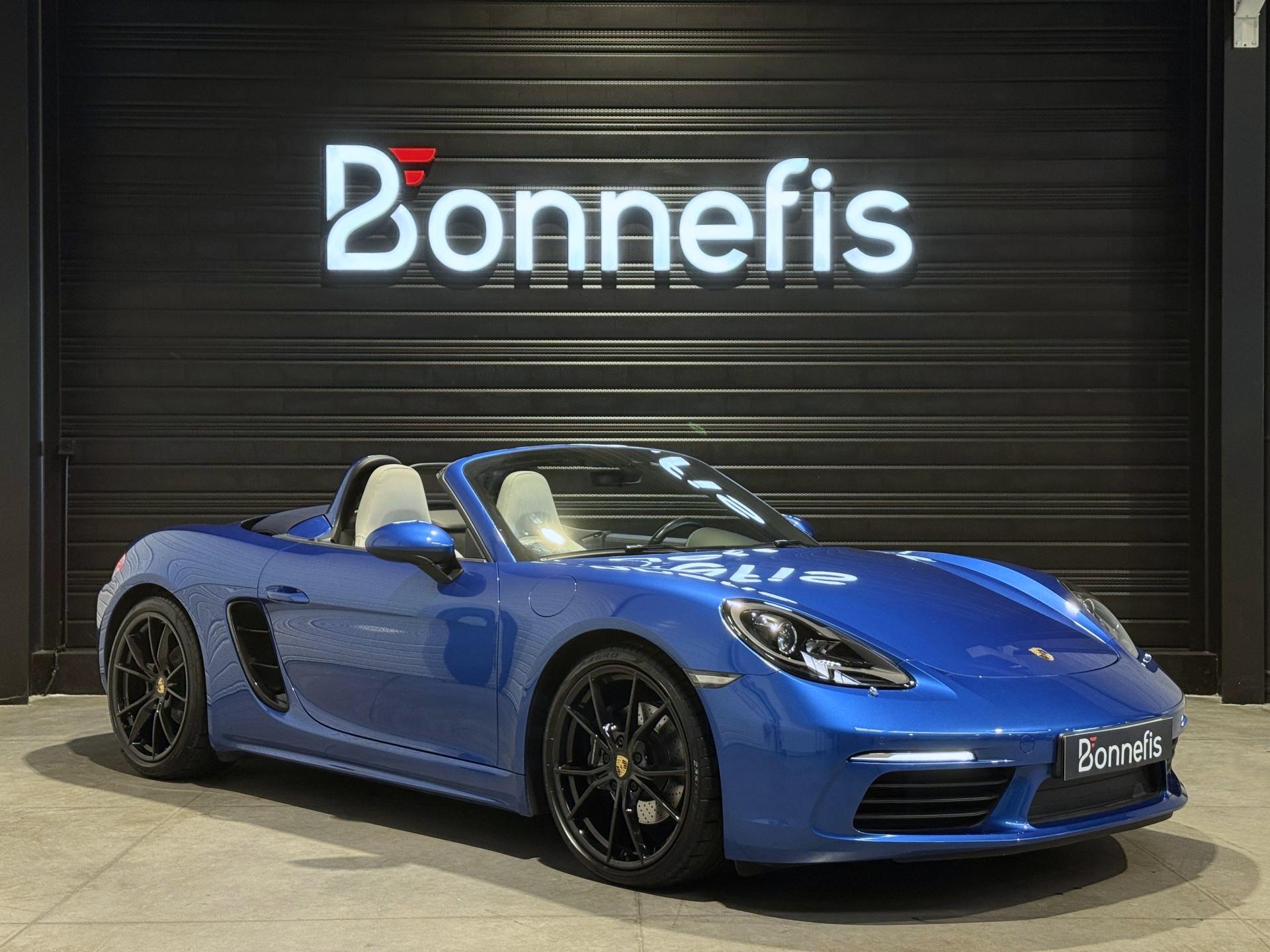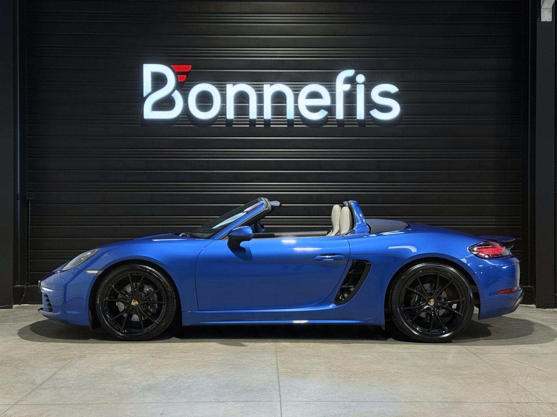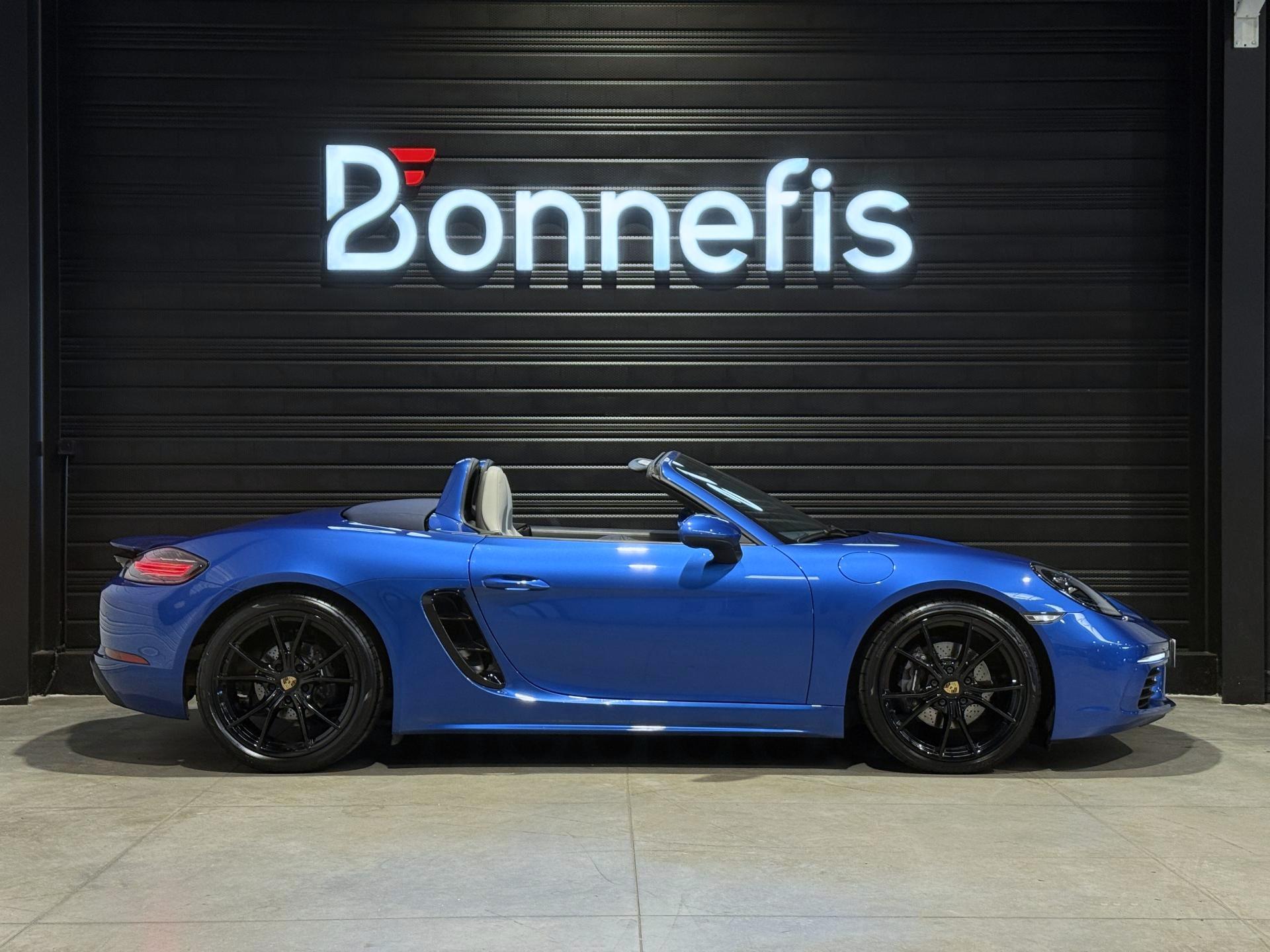 Porsche 718 Boxster 2.0 300 Ch BVA PDK cabriolet, extérieur bleu saphir métallisée, intérieur cuir bicolore Noir / Craie ( 3 590 € ), 19 cv, 2 portes, première mise en circulation le 23/03/2017.