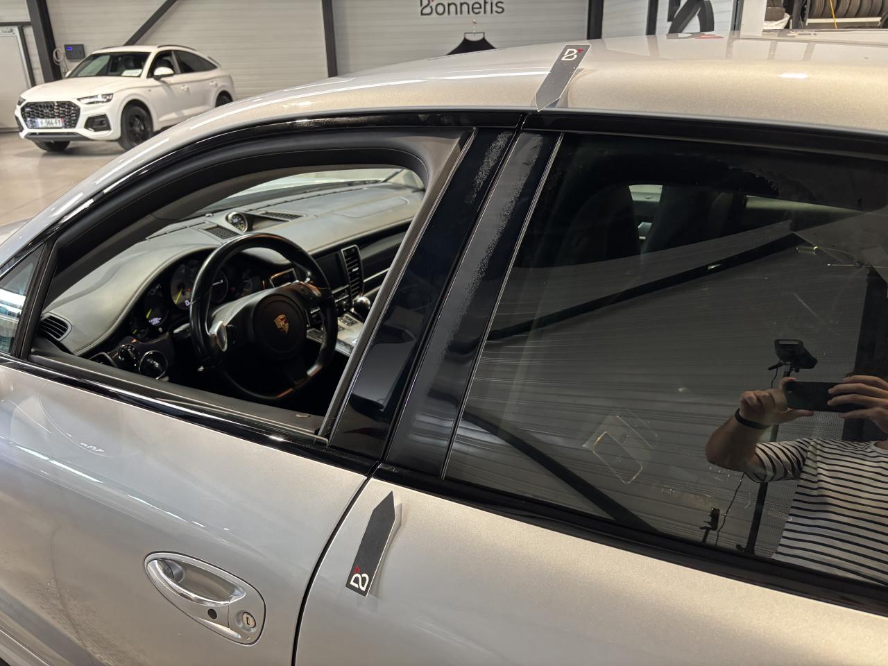 Nombreuses options : GPS, radars avants et arrières de détection d'obstacles, jantes Panamera Sport 20" peintes en noir finition brillante ( 4 380 € ), intérieur tout cuir Panamera dans les teintes de série, cuir lisse ( 3 468 € ), PORSCHE Communication Management (PCM) avec navigation étendue : DVD/VCD, écran AV, système de navigation à carte & voix, à boutons, DVD et navigation tous terrains, antenne diversifiée, information trafic ( 3 174 € ), BOSE Surround Sound-System avec PCM ( 1 224 € ), climatisation automatique 4 zones ( 1 188 € ), assistance parking AV et AR avec caméra de recul ( 1 140 € ), PORSCHE Entry & Drive ( 1 068 € ), jupes latérales SportDesign ( 978 € ), pack Sport Chrono ( 804 € ), portes Soft Close ( 708 € ), phares bi-xénon avec fonction PORSCHE Dynamic Light System (PDLS) ( 660 € ), pré-équipement téléphone portable ( 600 € ), vitrage AR fumées ( 528 € ), store pare-soleil électrique pour la lunette AR ( 504 € ), sièges chauffants à l'AV et à l'AR ( 492 € ), système d'alarme : alarme périphérique et volumétrique avec commande à distance ( 490 € ), radio numérique ( 480 € ), baguettes de seuil de porte supplémentaires en aluminium brossé ( 432 € ), pack mémoire conducteur ( 366 € ), affichage des limitations de vitesse ( 336 € ), système de transport sur toit ( 324 € ), interface audio universelle (AUX, USB, iPod) ( 312 € ), volant chauffant ( 300 € ), services en ligne ( 180 € ), tapis de sol ( 180 € ), 2 porte-gobelets escamotables au-dessus de la boîte à gants...